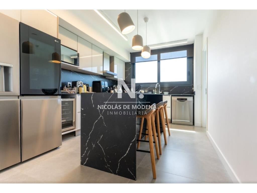 La cocina con terraza es un espacio funcional y agradable, completamente equipada con anafe, microondas, heladera con freezer, campana y horno, complementado con amplios placares. El living comedor es luminoso y acogedor, ideal para reuniones o momentos de relax, y está equipado con Smart TV y aire acondicionado para mayor confort.