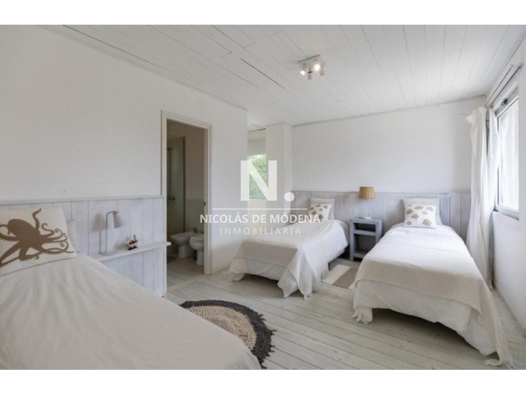 El acceso a la segunda planta se realiza mediante una escalera interna que conduce a un playroom con TV, creando un espacio versátil y luminoso ideal para actividades lúdicas o para establecer un ambiente de relax familiar. En este nivel se encuentra la suite principal, que destaca por su amplio vestidor y una espectacular vista al mar, proporcionando un refugio íntimo y sereno. Los dormitorios adicionales están configurados de forma que dos de ellos disponen de camas individuales, mientras que el tercer se ofrece con tres camas, brindando así una generosa capacidad de alojamiento y flexibilidad para adaptarse a diversas necesidades.
