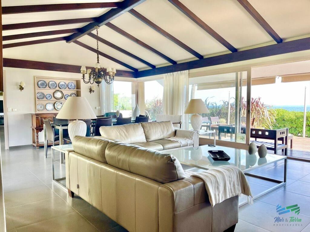 En un lote de más de 1.300 m2 y desarrollada en 384 m2 distribuidos una sola planta, esta espléndida propiedad cuenta con un espacioso living comedor con hogar a leña y grandes ventanales de piso a techo que permiten disfrutar el jardín y la vista al mar desde el interior de la casa.