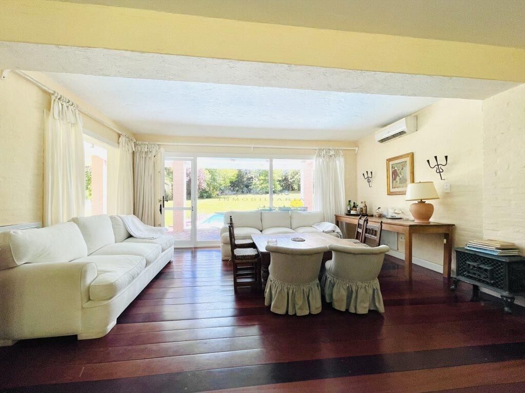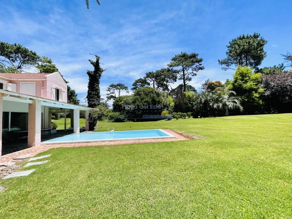 Jardín que rodea toda la casa, con cerramiento perimetral, ofreciendo una vista despejada y verde desde cualquier rincón. Aquí se ubica el parrillero techado con living exterior y excepcional piscina.