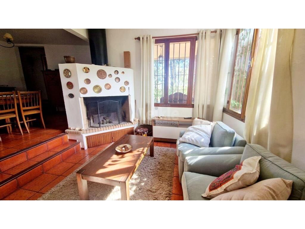 Living con estufa leña. Comedor con cocina integrada.
