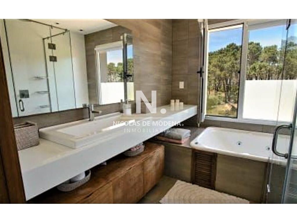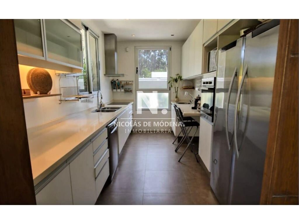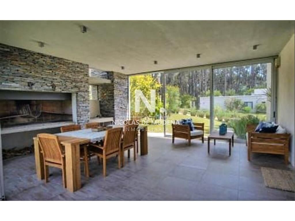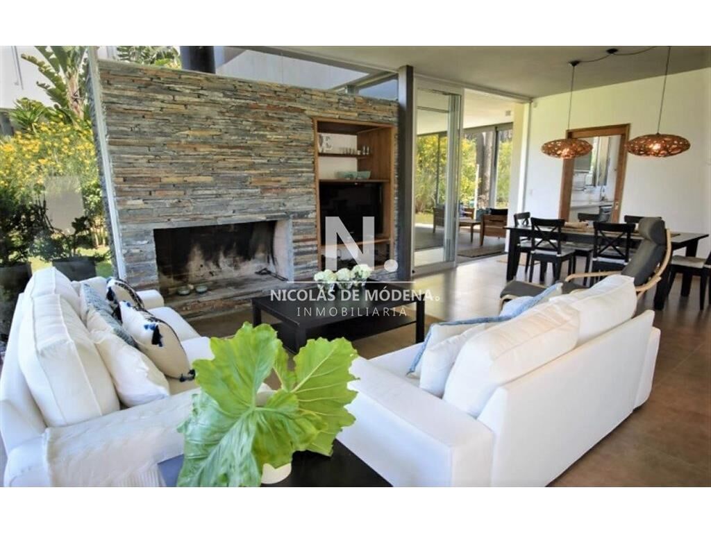 En un lote de 1.200 m2 y desarrollada en 400 m2 distribuidos en dos plantas, esta espléndida propiedad cuenta con un espacioso living comedor con hogar a leña, y ventanales de piso a techo que permiten disfrutar el jardín desde el interior de la casa. Barbacoa cerrada, bien equipada, con comunicación al interior de la casa y salida al jardín.