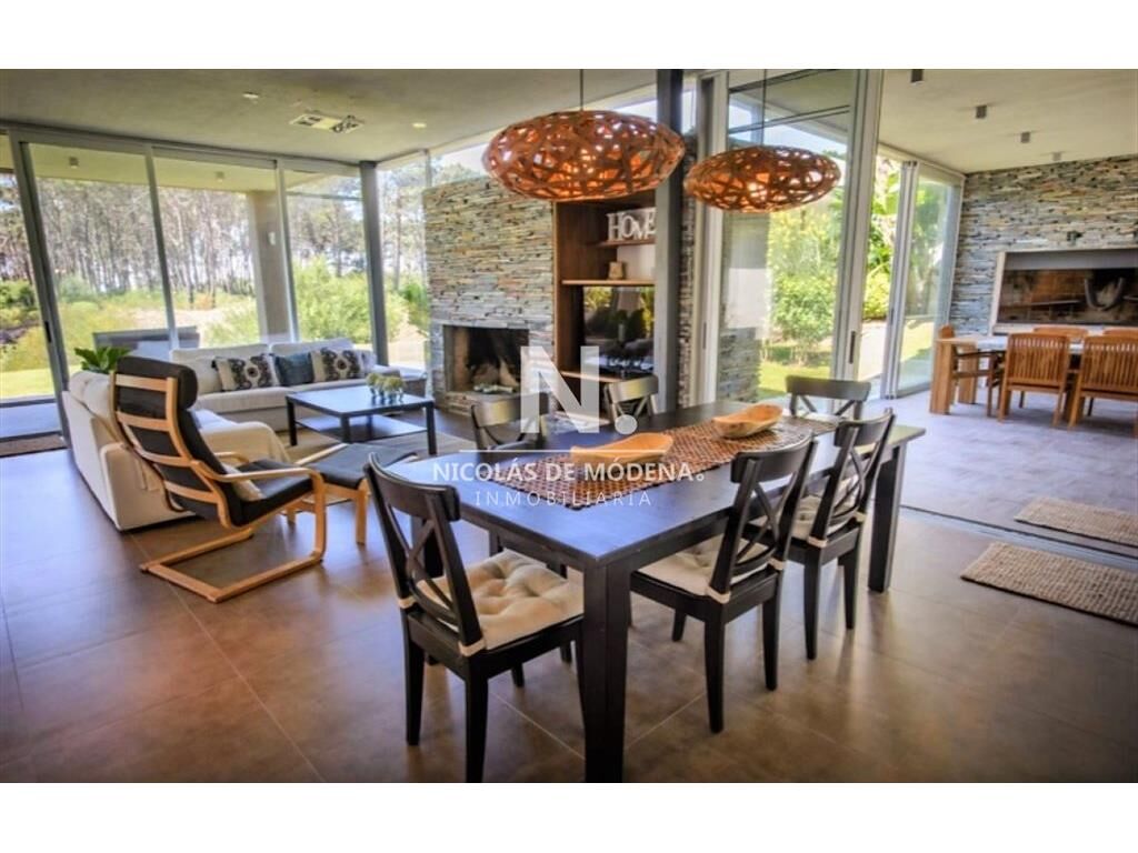 En un lote de 1.200 m2 y desarrollada en 400 m2 distribuidos en dos plantas, esta espléndida propiedad cuenta con un espacioso living comedor con hogar a leña, y ventanales de piso a techo que permiten disfrutar el jardín desde el interior de la casa. Barbacoa cerrada, bien equipada, con comunicación al interior de la casa y salida al jardín.