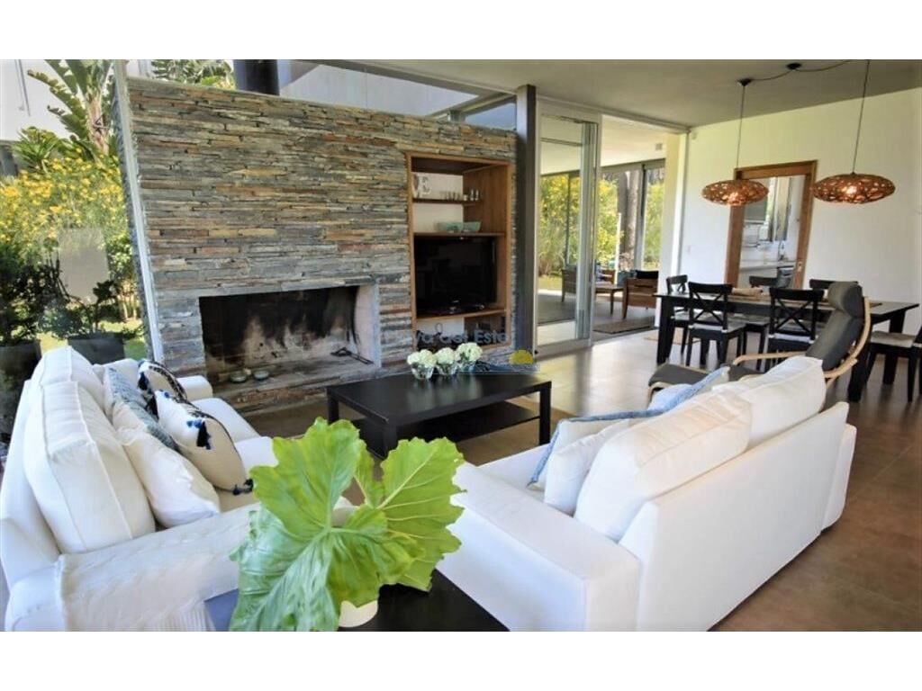 En un lote de 1.200 m2 y desarrollada en 400 m2 distribuidos en dos plantas, esta espléndida propiedad cuenta con un espacioso living comedor con hogar a leña, y ventanales de piso a techo que permiten disfrutar el jardín desde el interior de la casa. Barbacoa cerrada, bien equipada, con comunicación al interior de la casa y salida al jardín.