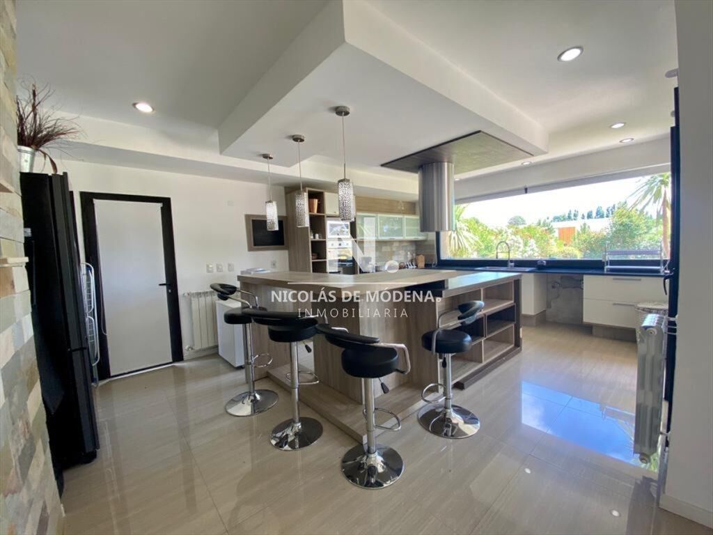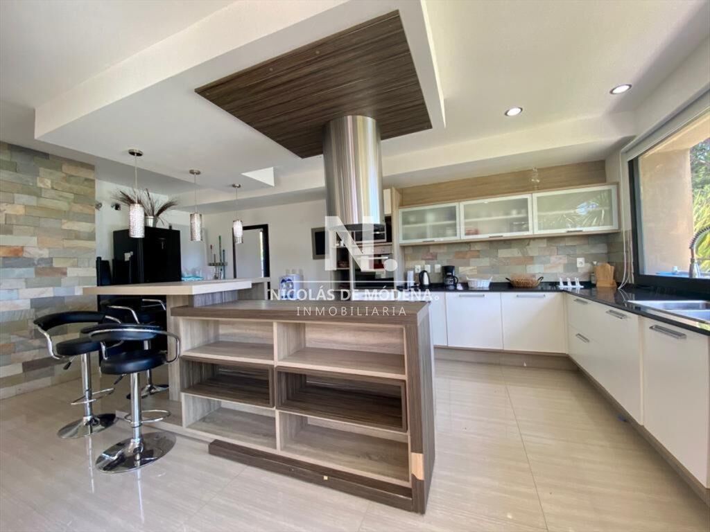 Cocina con isla y desayunador completamente equipada.