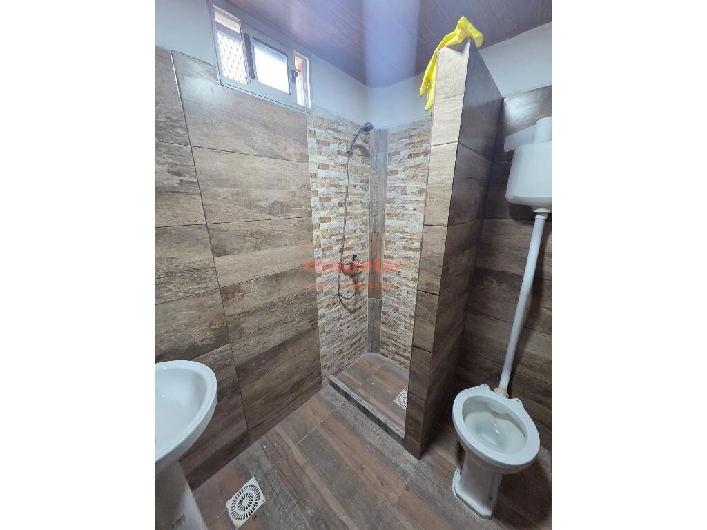 Baño completo con placard empotrado en pared con conexión para calefón y cajones. Lavabo con mesada de mármol y mueble bajo lavabo. Mampara de vidrio en ducha.