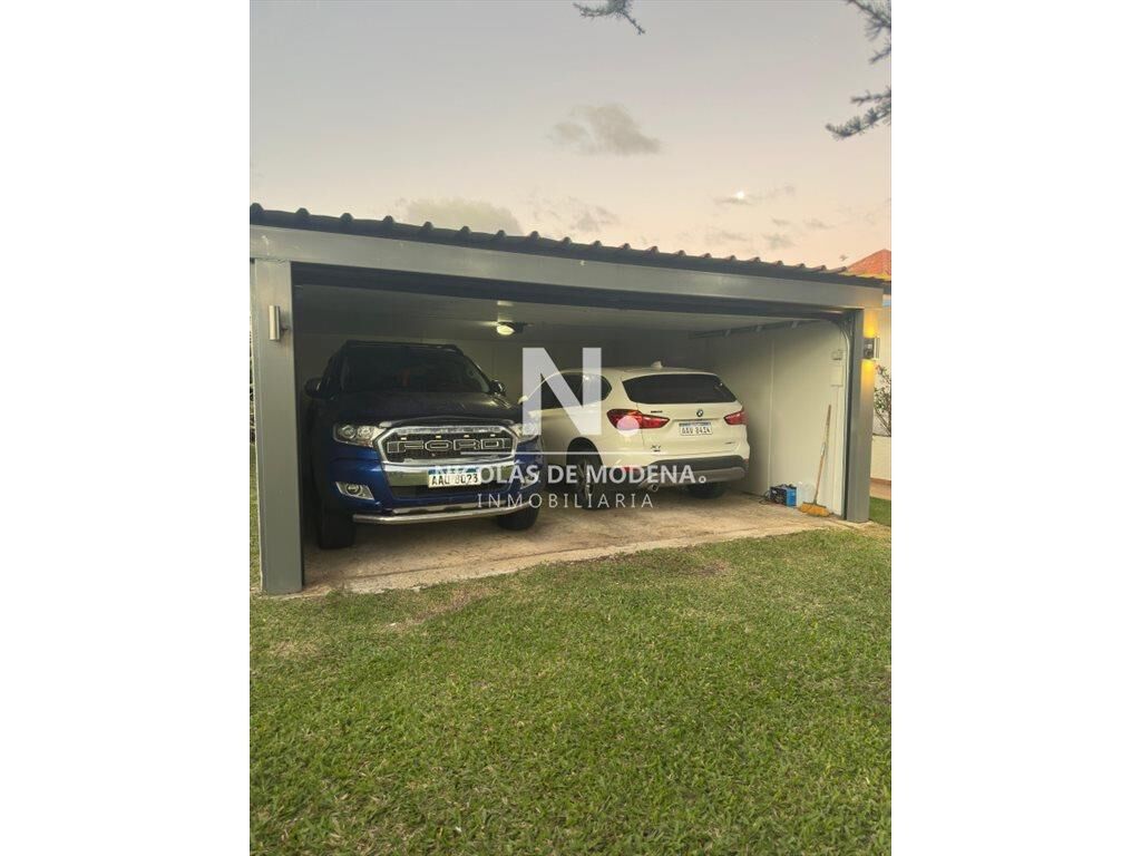 Gran garaje externo para 2 vehículos y garaje internos para un auto con espacio de guardado.