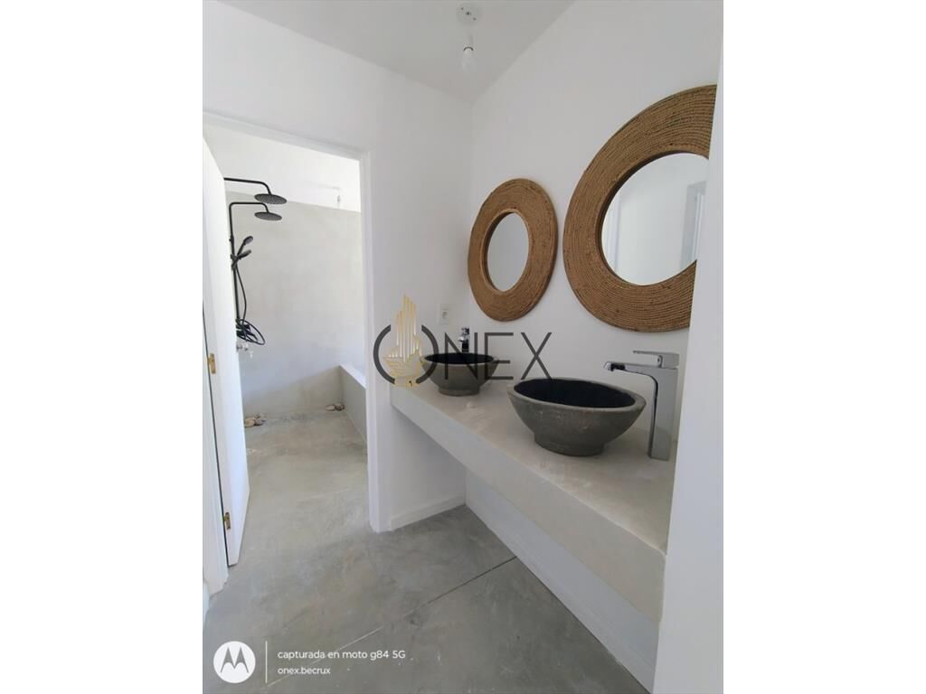 1 baño completo tipo spa con bañadera de hormigón, doble ducha y salida directa al deck