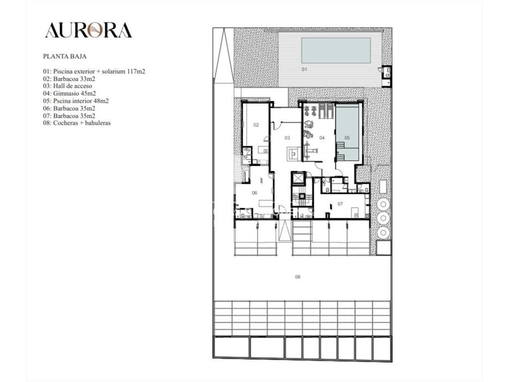Se desarrolla en planta baja con piscina interior y exterior, gimnasio, barbacoas y estacionamientos con bahuleras.