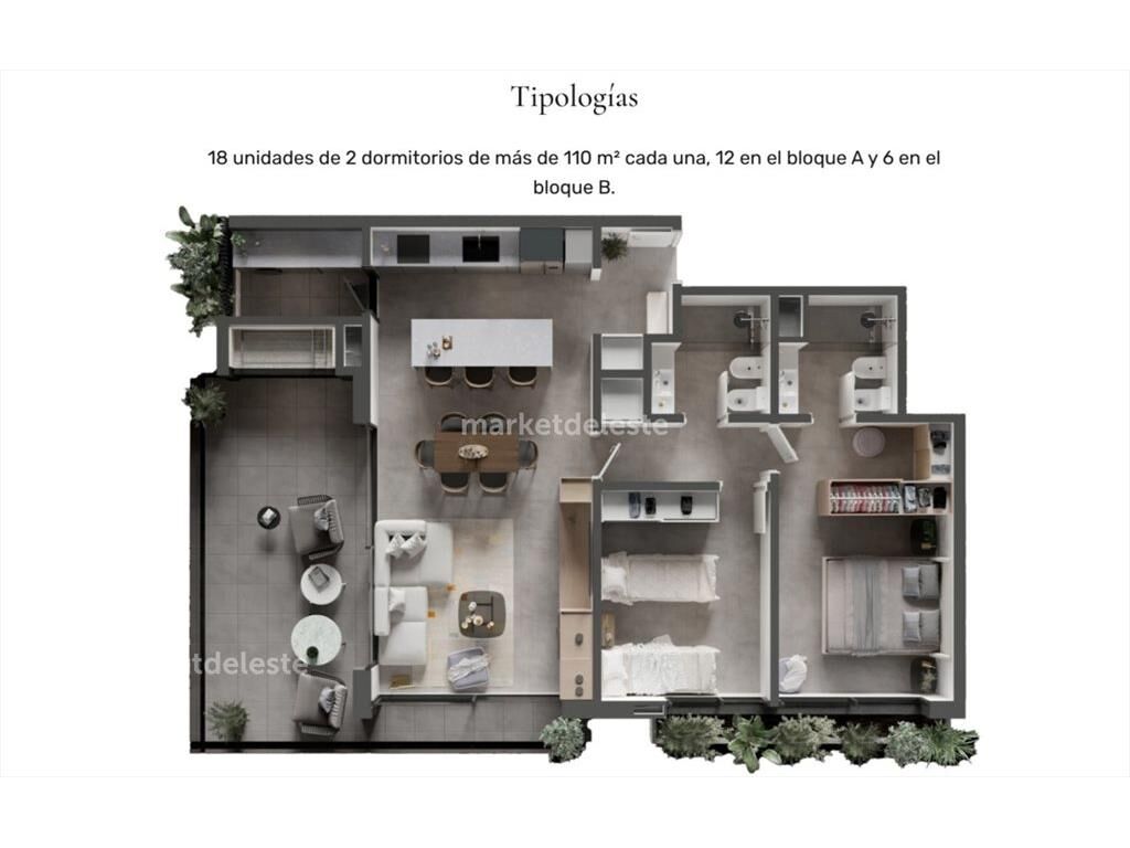 En lo que sera el complejo de dos blocks bajos en LA BARRA llamado DUO se encuentra esta unidad en block B Tipologia 02 de 112 m2 totales con terraza con parrilla, amplio living comedor, cocina definida con terraza lavadero y dos dormitorios , uno de ellos en suite , cada unidad se entrega con dos espacios de estacionamiento , uno debajo del edificio y otro que corresponde a una cochera abierta de uso exclusivo.