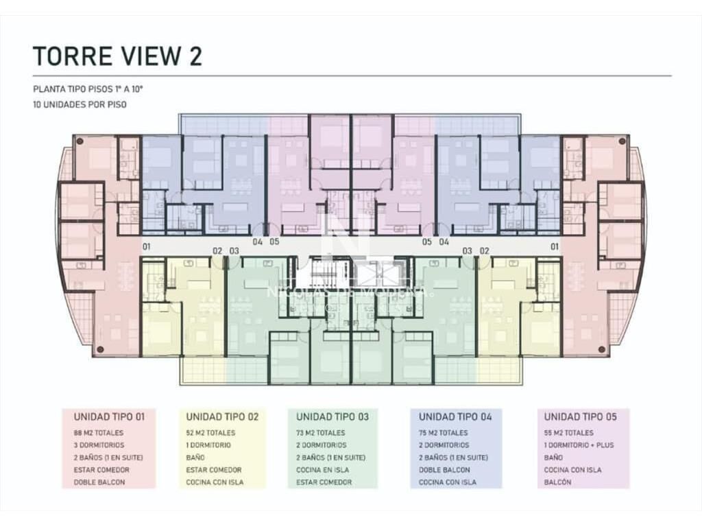 View Tower se distribuye en 10 plantas con 10 unidades por piso y distintas tipologías, de uno, dormitorio y medio, dos dormitorios y tres dormitorios.