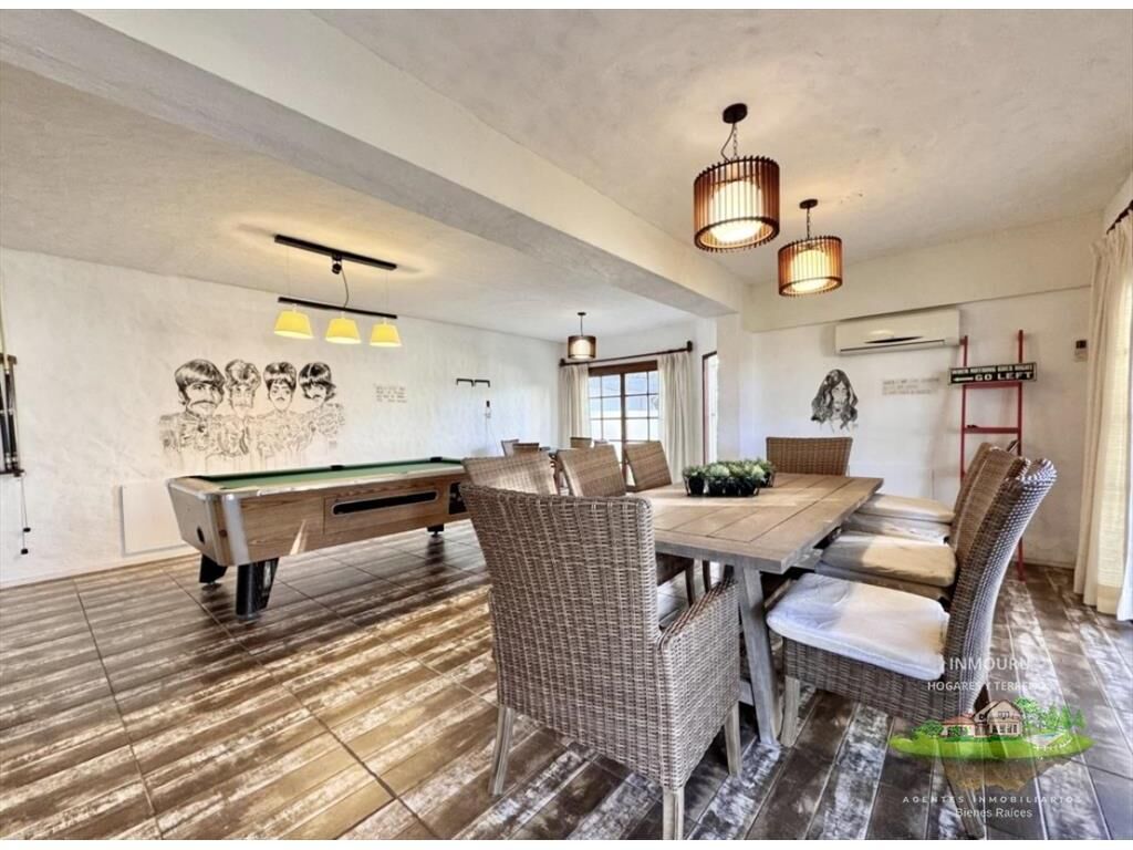 Gran jardín, totalmente cercado, donde se ubica la piscina climatizada junto a la barbacoa cerrada, que cuenta con mesa de ping pong, pool, cocina y un muy buen espacio para recibir invitados. También tiene su baño completo.
