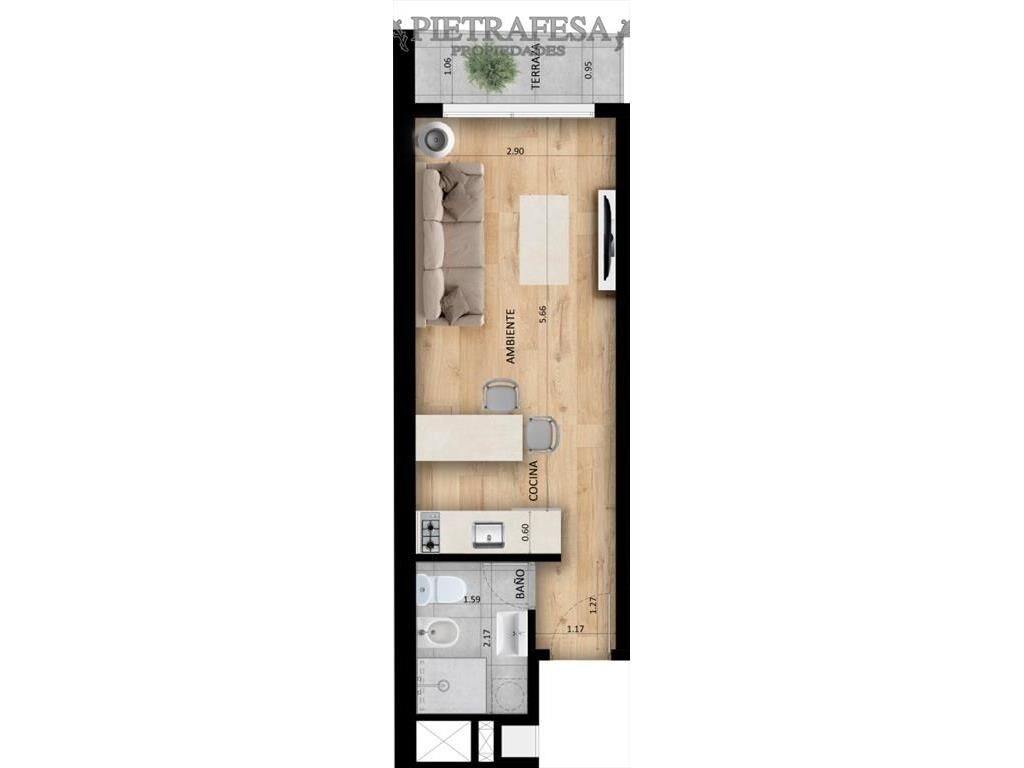 Unidad monoambiente, 2do piso al frente, 27.26m Internos 3.29m Terraza.