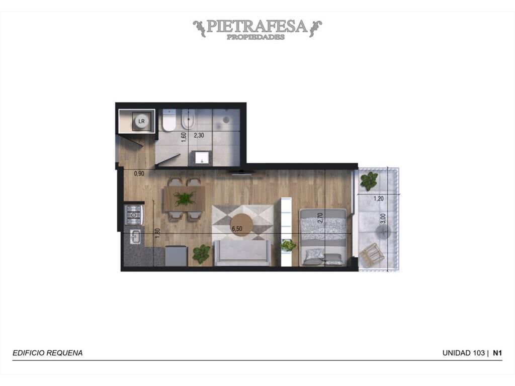 Unidad monoambiente en 1er piso, 27.5m internos, 3.5m terraza.
