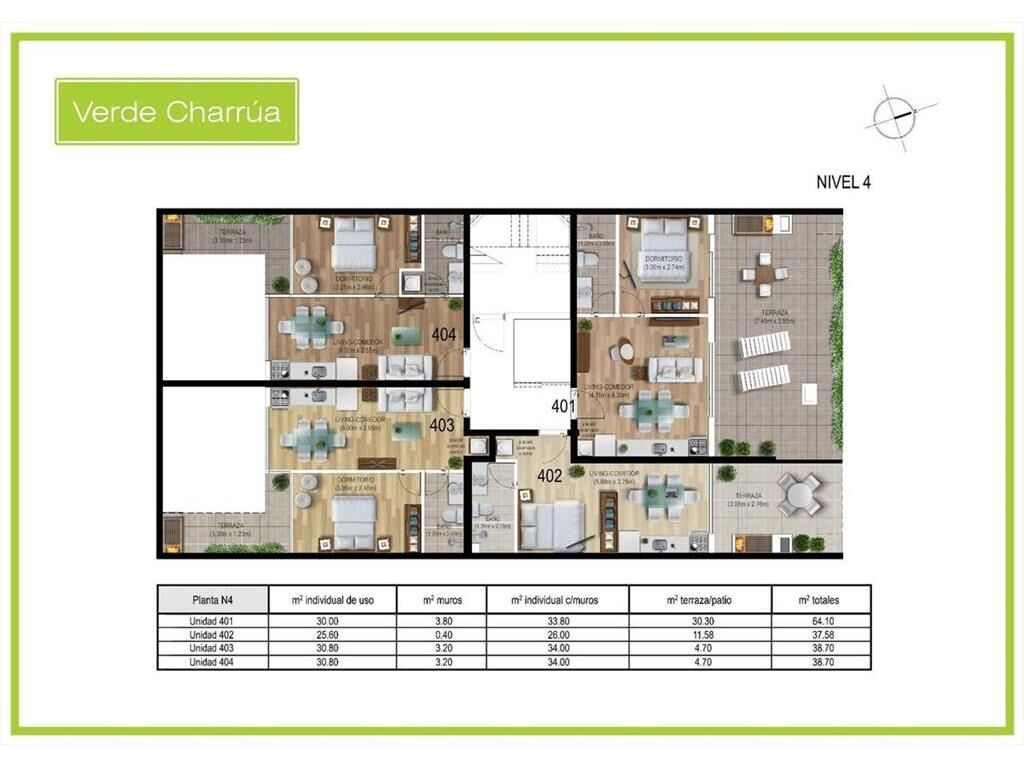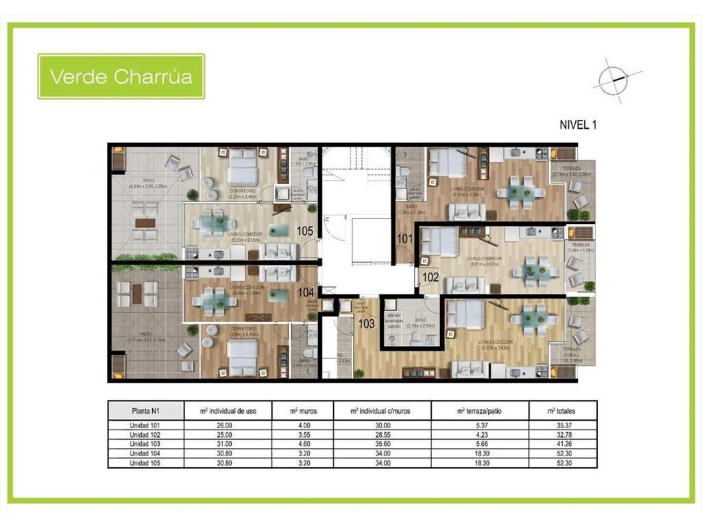 Ubicado en Charrúa y Gaboto, este moderno edificio ofrece monoambientes, 1 y 2 dormitorios con amplias terrazas y parrilleros de uso exclusivo en todas las unidades.