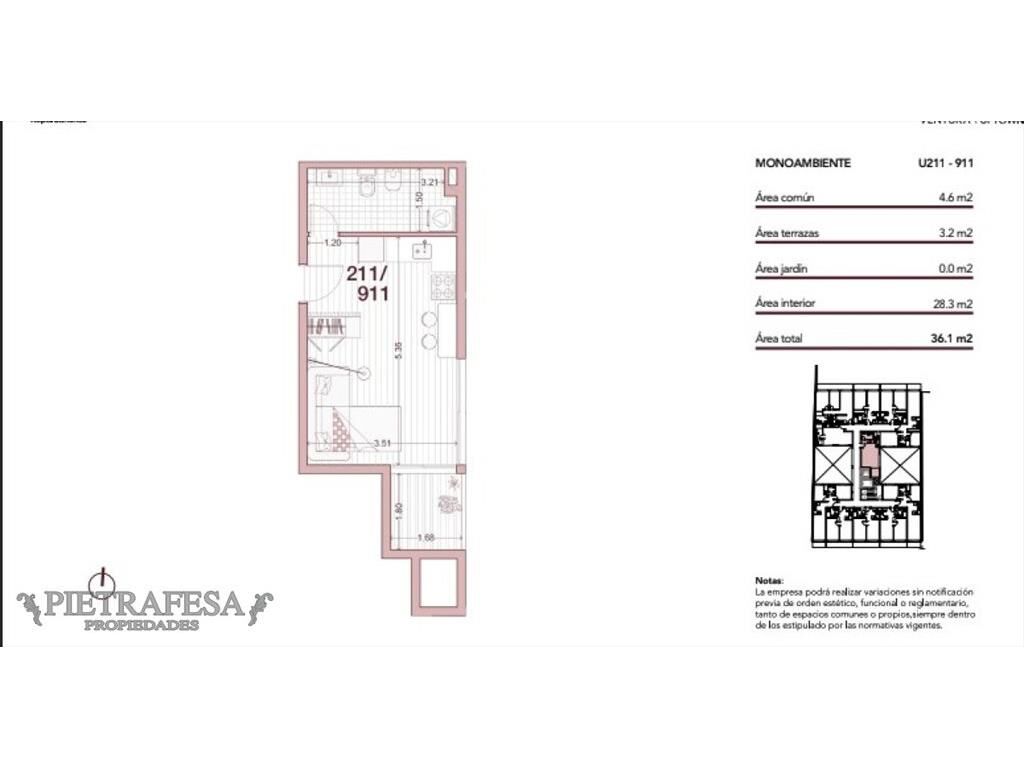 Unidad monoambiente en piso 6, área interior 28.3m2, terraza 3.2m2.