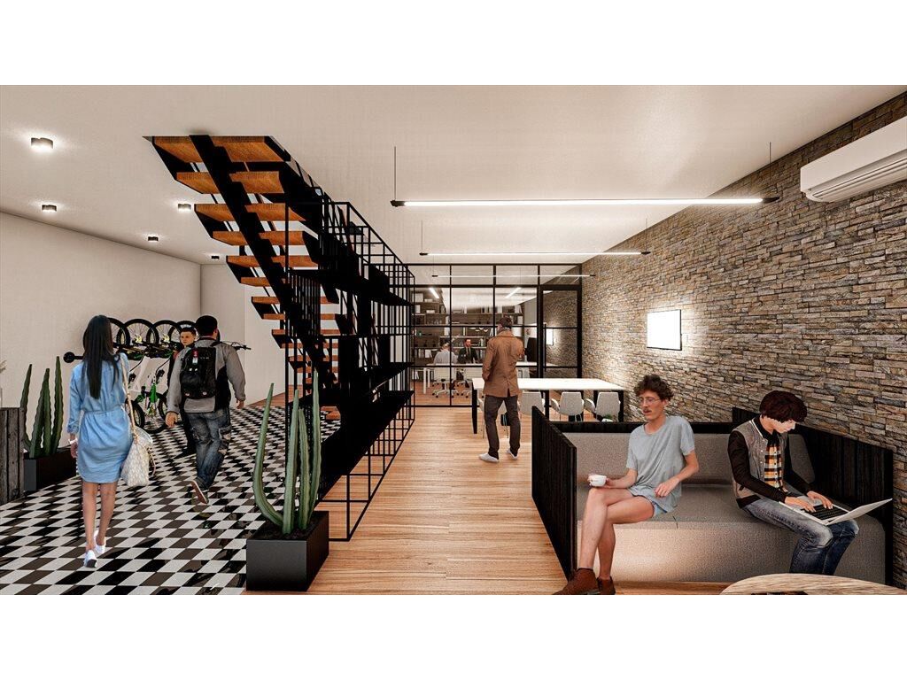 En planta baja se ubican la cafetería, el espacio co work, SSHH y el loundry.