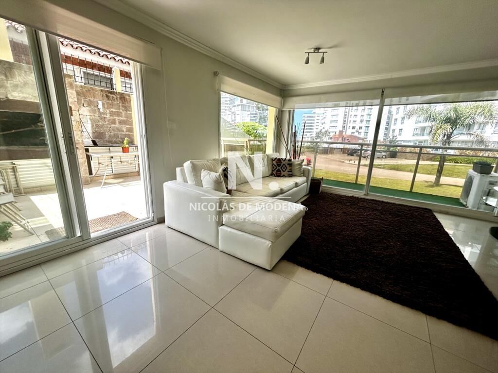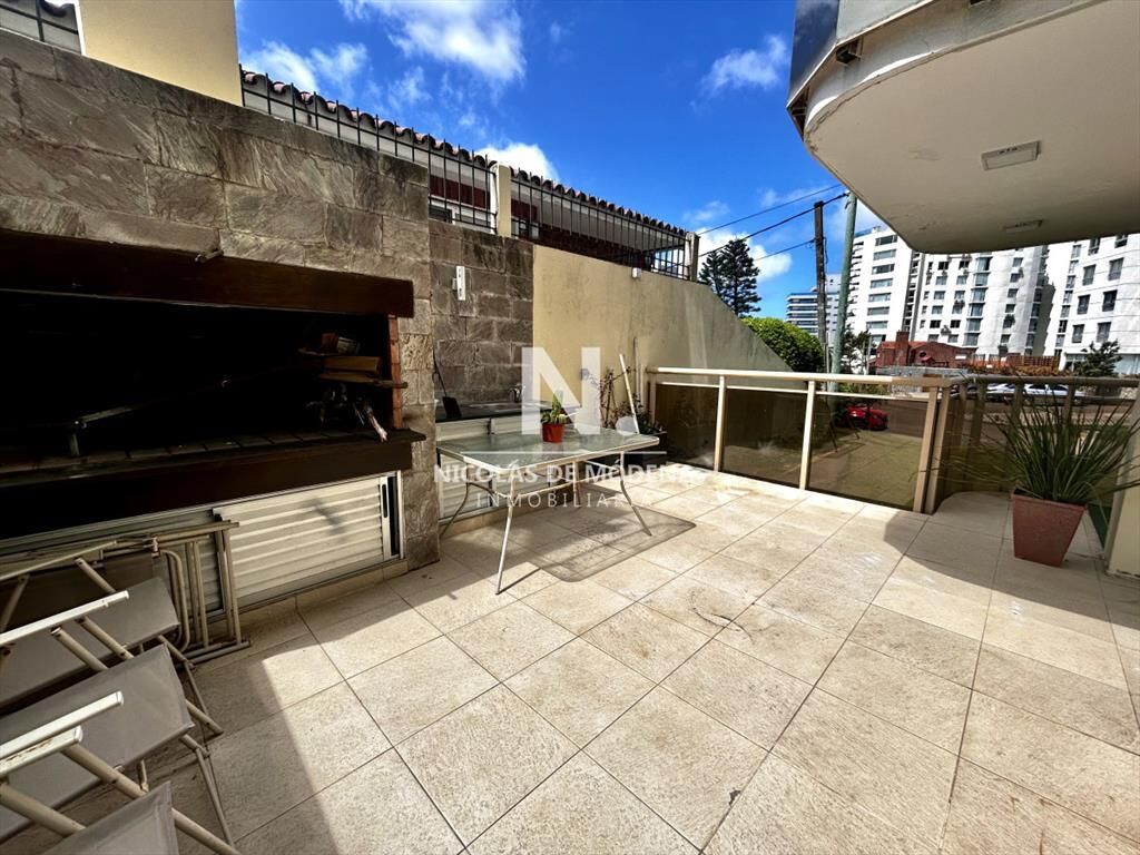 Living comedor con salida a una amplia terraza con parrillero y vista parcial al mar
