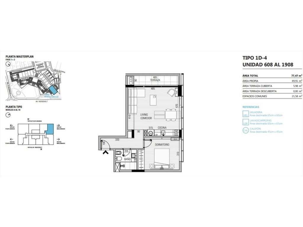 Departamento de 1 dormitorio, 1 baño, living-comedor con cocina integrada.