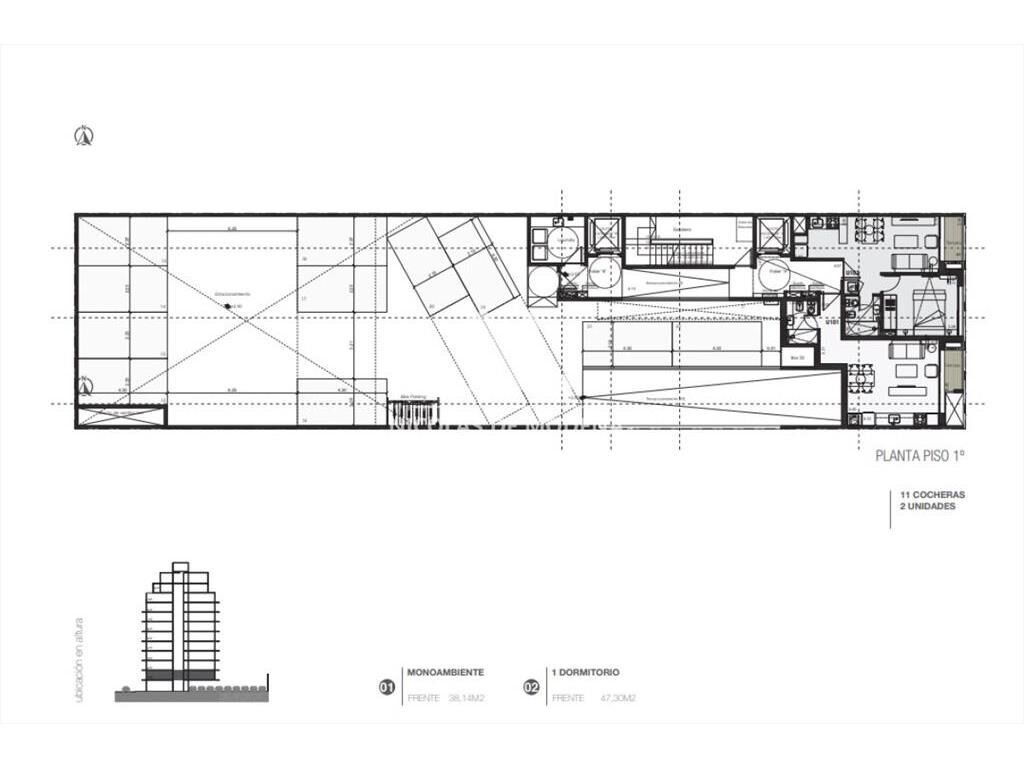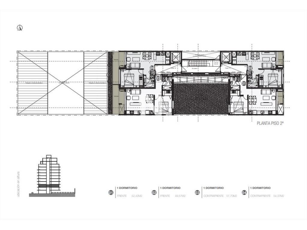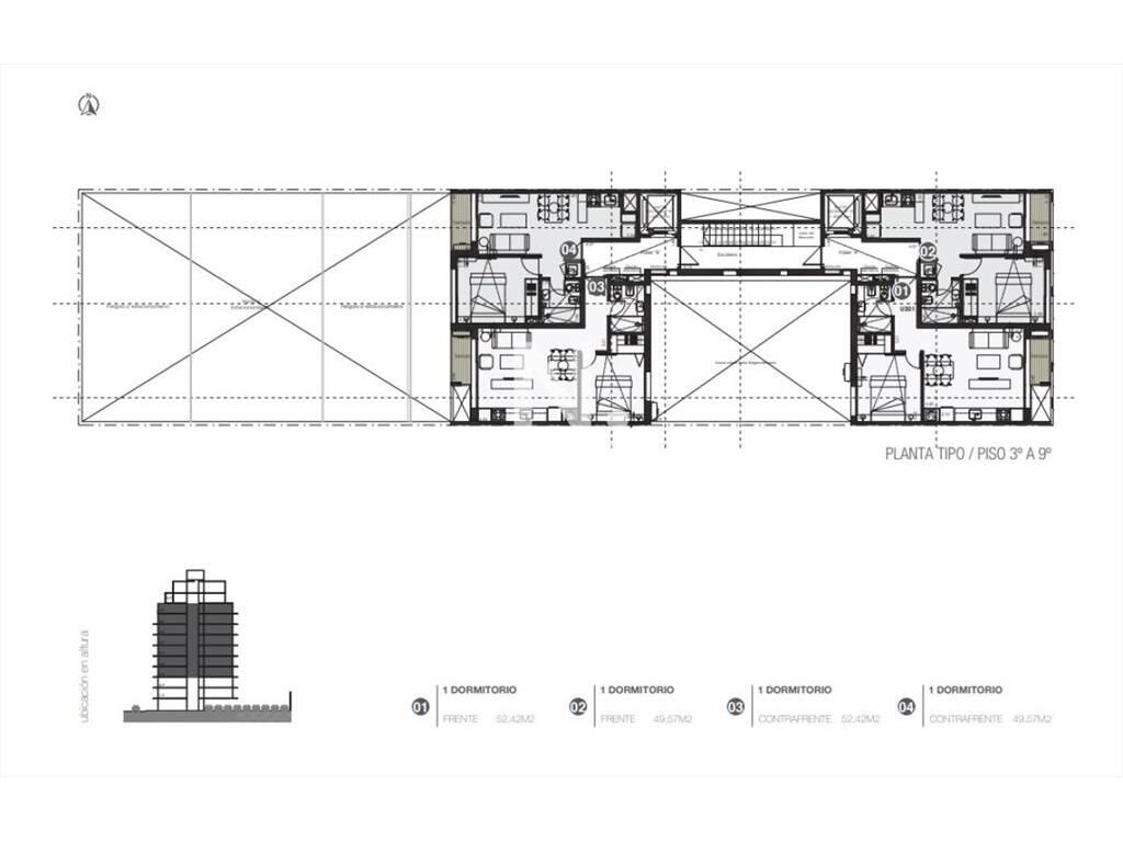 Presenta un programa de viviendas con 35 unidades de 1 dormitorio, 1 de dos dormitorios ubicado en penthouse con terraza y parrillero de uso exclusivo, conformando un total de treinta y ocho unidades.