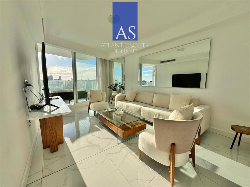 Apartamento de dos dormitorios uno suite mas toilette social, palier privado con ocho ascensores de gran velocidad, la ubicación del edificio en primera linea frente al mar ofrece una vista totalmente panorámica de la Playa Mansa.