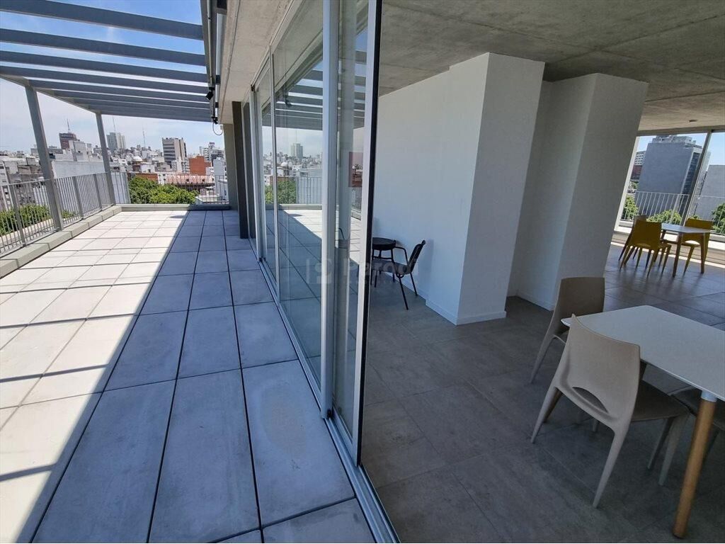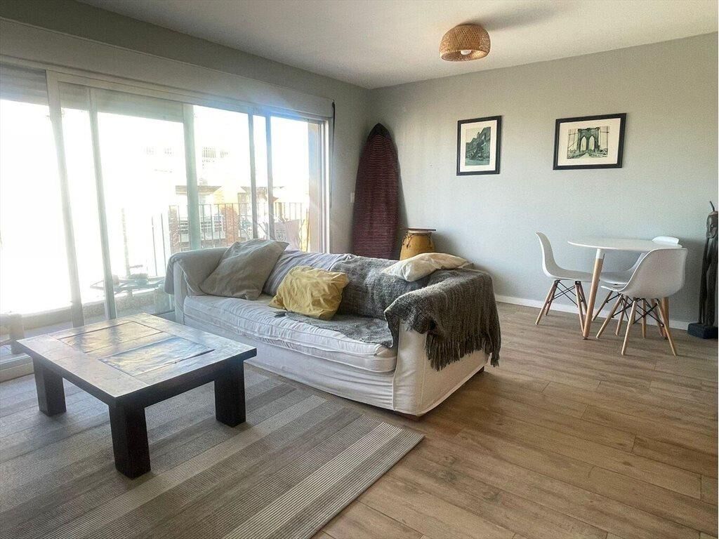 Muy luminoso! Living comedor con amplios ventanales con vista despejada, con salida a terraza. Sillón cama , juego de comedor, Rack TV.
