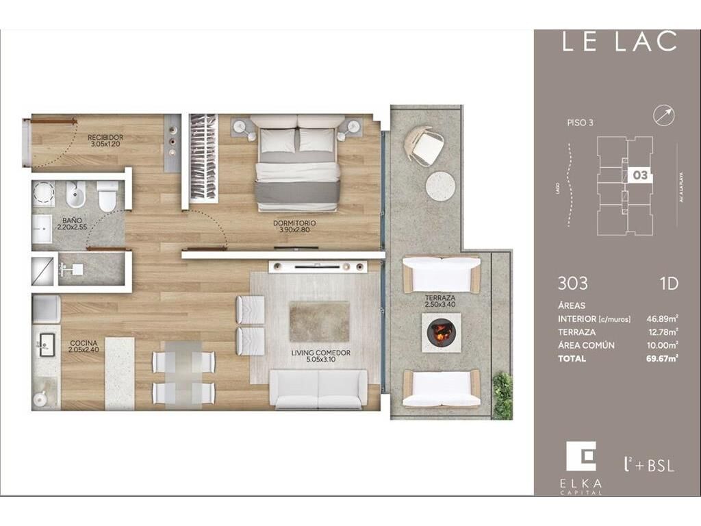 El área del apartamento es de 47 metros cuadrados mas una terraza techada de 13 metros cuadrados.