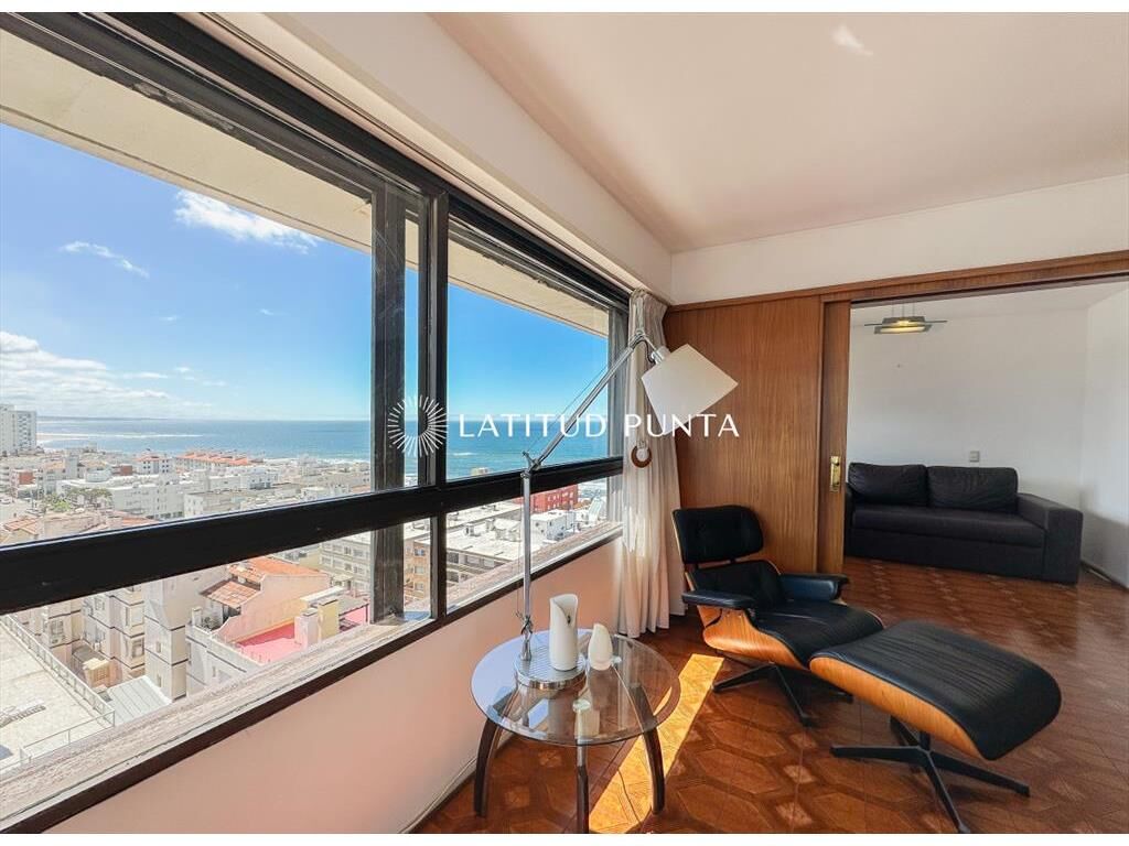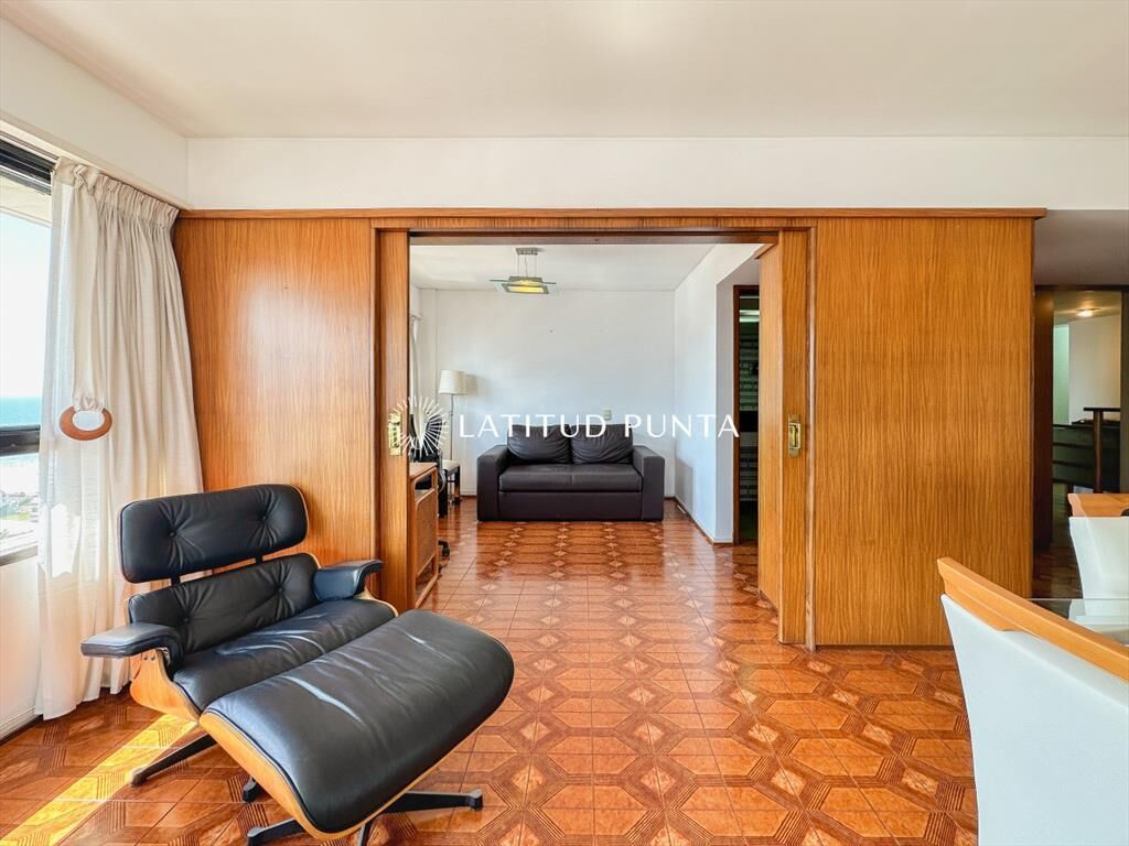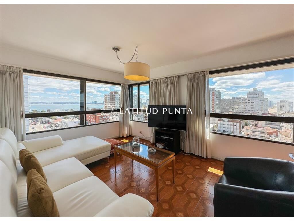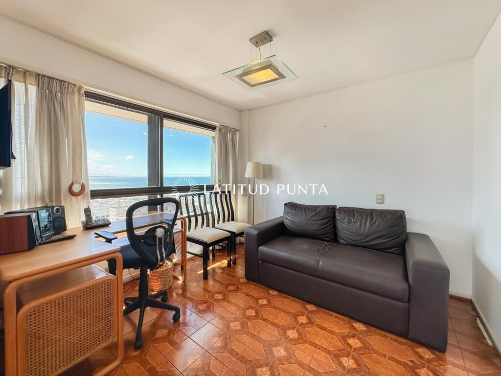 Amplio y luminoso apartamento en piso alto orientado hacia el Norte, con excelentes vistas tanto a playa Mansa como Brava. 3 dormitorios (2 suites) más dependencia completa. 3 baños en total. Living-comedor esquinero con tercer dormitorio integrable a través de puerta corrediza (este dormitorio con su baño en suite). Cocina definida amplia con lavadero y posibilidad de comedor diario. Persianas automatizadas en todos los ambientes. Loza radiante central incluida en las expensas. Garage en subsuelo. El edificio cuenta con recepción 24hs, servicio de mucamas diario, gimnasio, barbacoa, playroom y sauna.