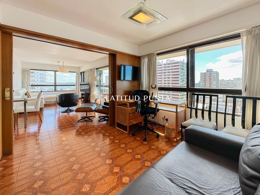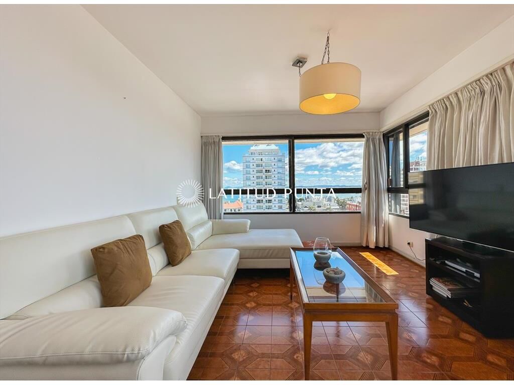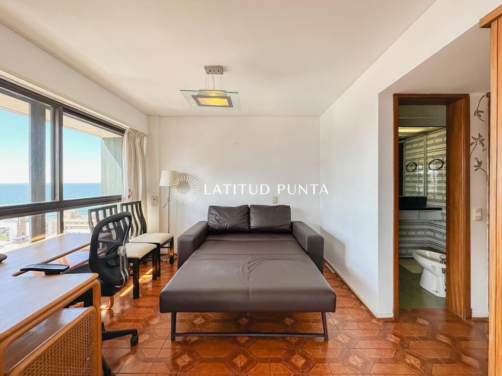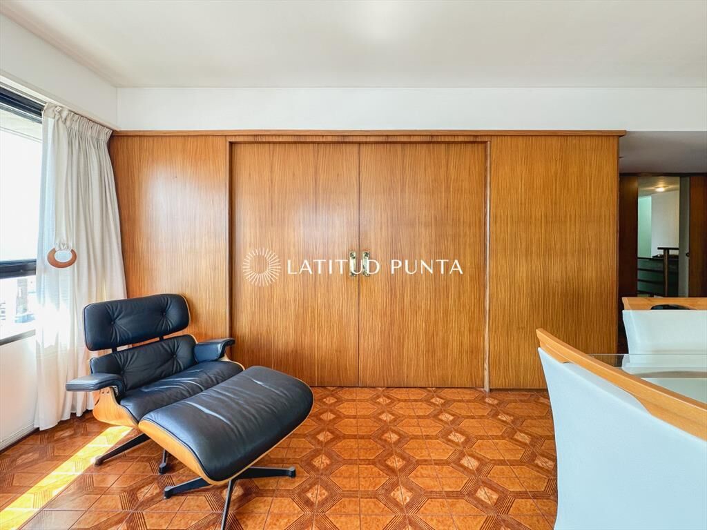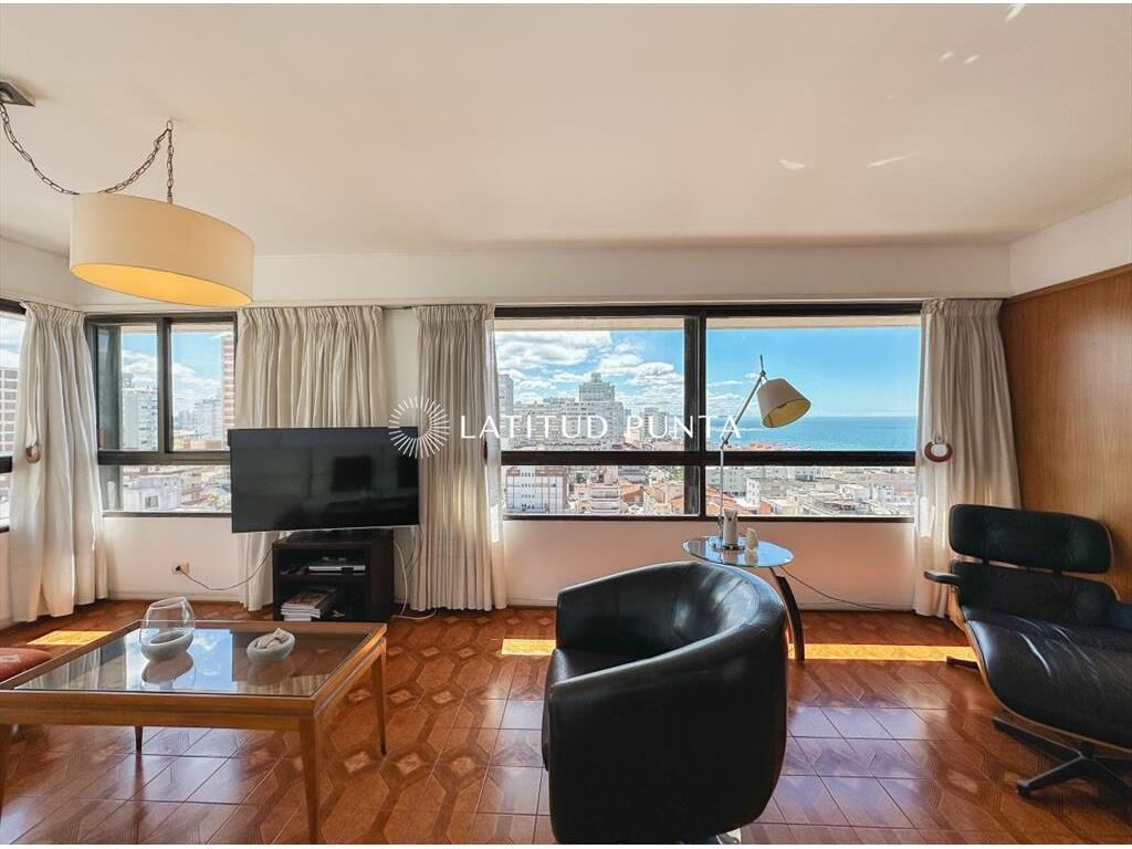Amplio y luminoso apartamento en piso alto orientado hacia el Norte, con excelentes vistas tanto a playa Mansa como Brava. 3 dormitorios (2 suites) más dependencia completa. 3 baños en total. Living-comedor esquinero con tercer dormitorio integrable a través de puerta corrediza (este dormitorio con su baño en suite). Cocina definida amplia con lavadero y posibilidad de comedor diario. Persianas automatizadas en todos los ambientes. Loza radiante central incluida en las expensas. Garage en subsuelo. El edificio cuenta con recepción 24hs, servicio de mucamas diario, gimnasio, barbacoa, playroom y sauna.