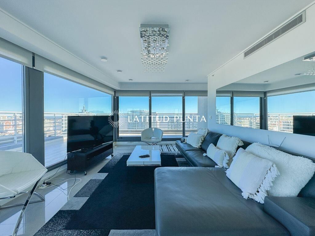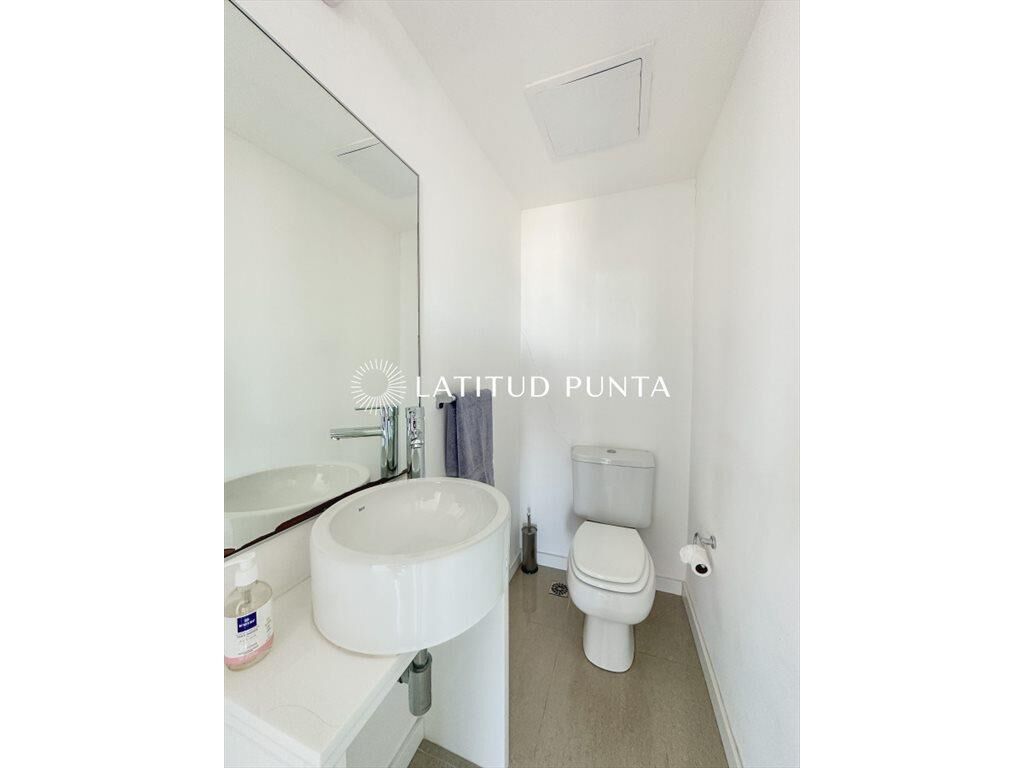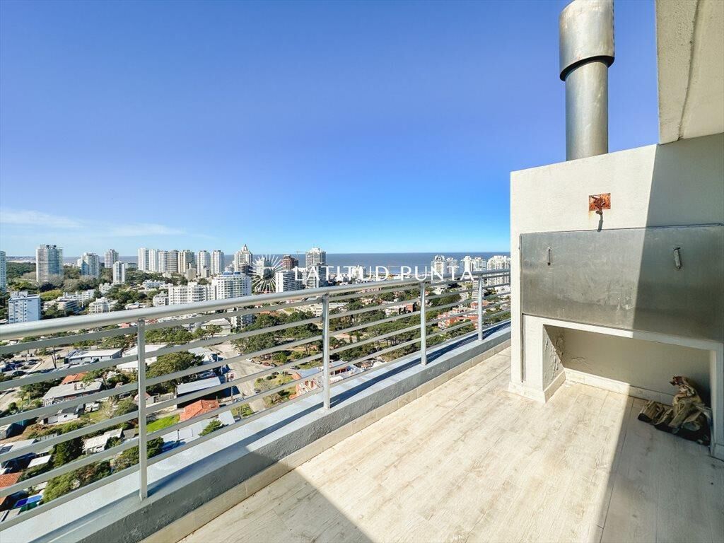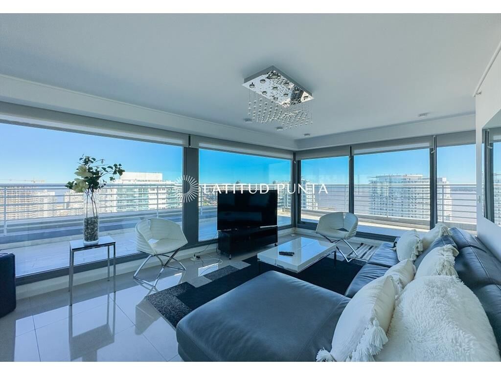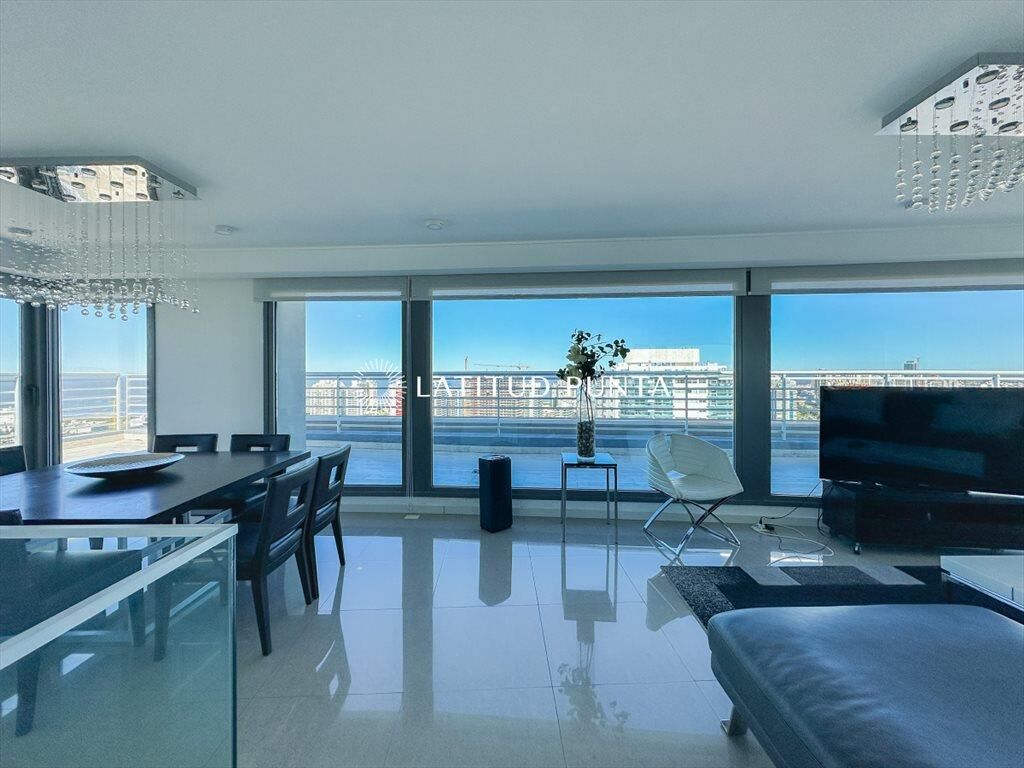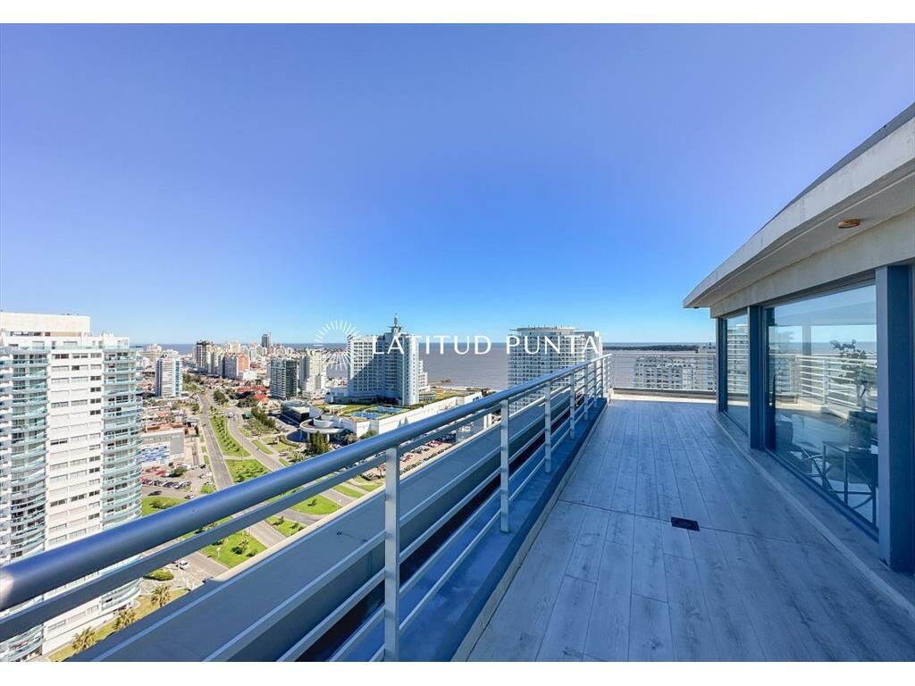 Extenso apartamento penthouse a pasitos de playa Mansa y Enjoy Conrad. Duplex desarrollado en dos niveles. En planta alta encontramos un gran living-comedor con salida a terraza envolvente con vistas a toda la ciudad y parrillero. Toilette y cocina definida. En el nivel inferior, 3 dormitorios en suite (3 baños completos), sector de lavadero y dependencia de servicio con baño. Edificio de excelente diseño con amenities de primera categoría.