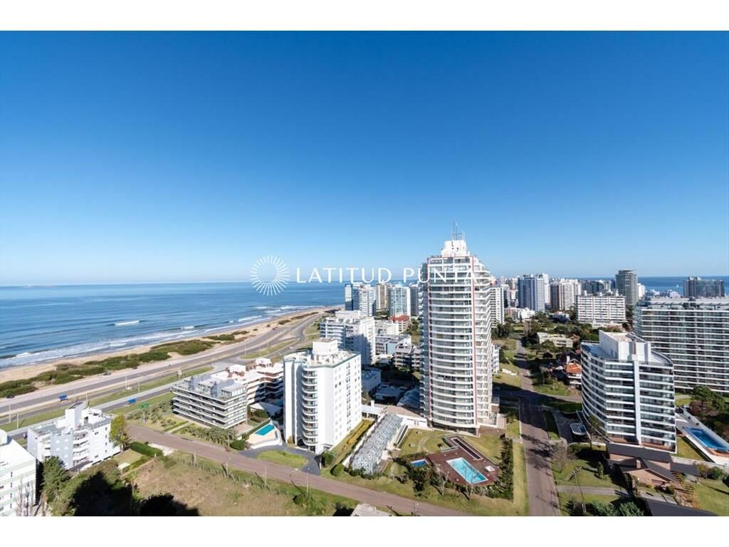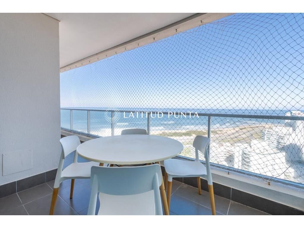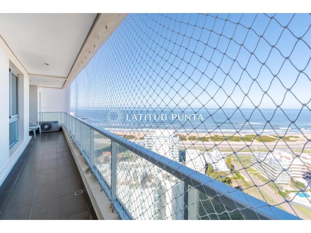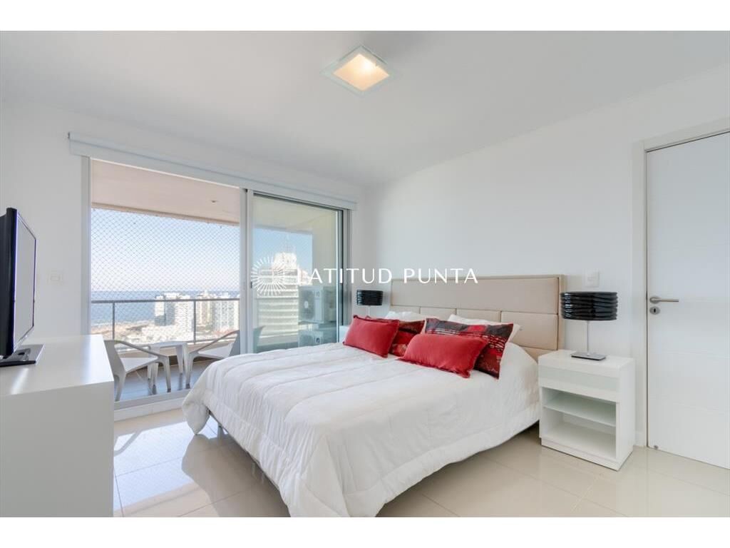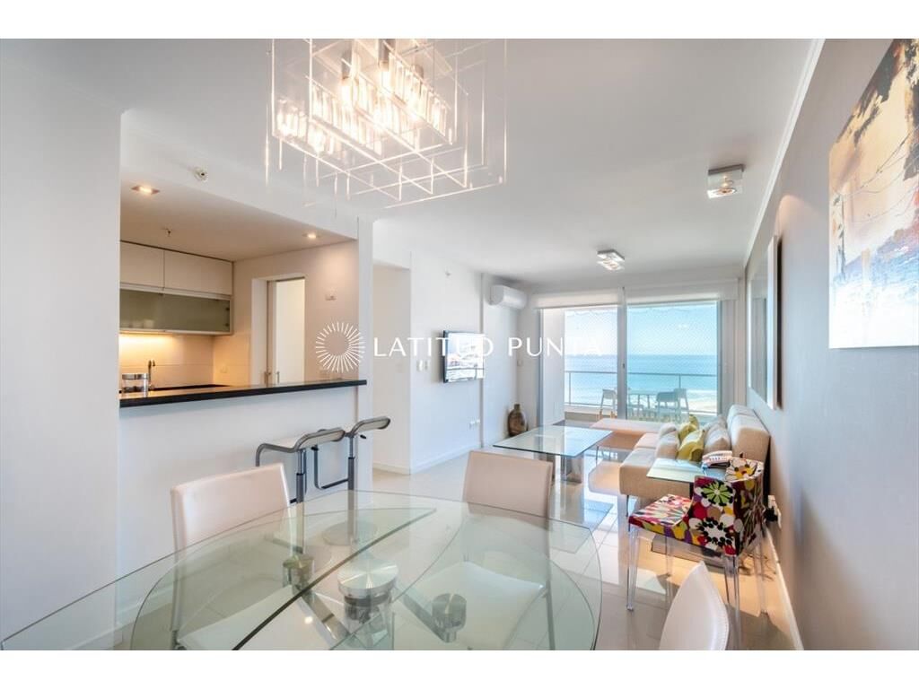 Moderno apartamento en torre de categoría, a 100 metros de Playa Brava, Punta del Este. Excelente planta, con espacios amplios y luminosos, piso alto, con muy buena vista al mar de Playa Brava y a los atardeceres de la Mansa. Dispone de dos dormitorios, el principal en suite con vestidor, dos baños completos. Living-comedor con extenso balcón mirando hacia el mar. Cocina bien equipada con barra-desayunador. Cuenta con losa radiante sectorizada, aire acondicionado y garage en subsuelo. Amenities completos.