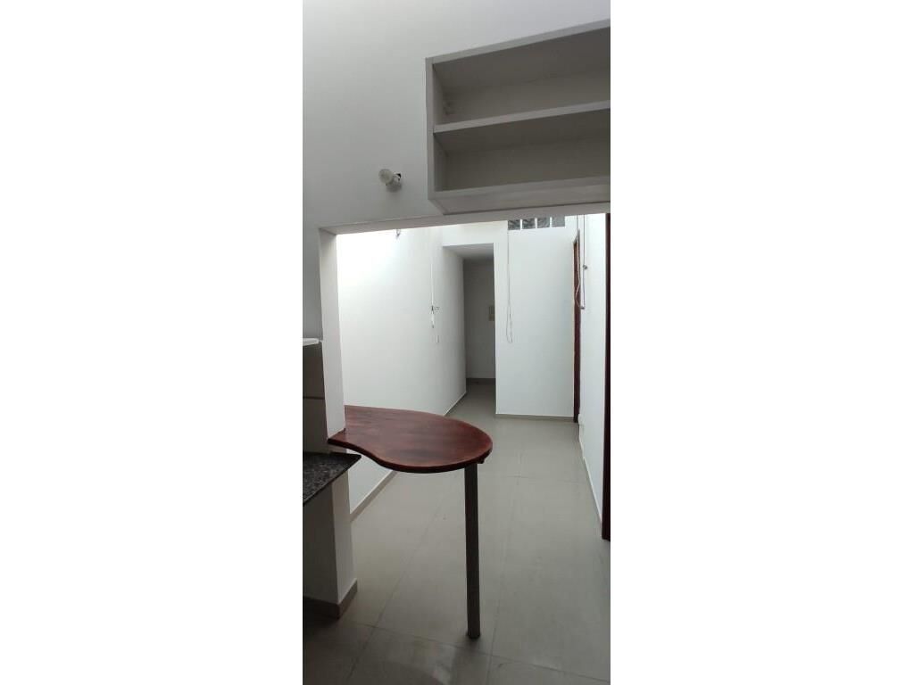 Living-comedor con cocina semi integrada, con varios placares y una barra de madera