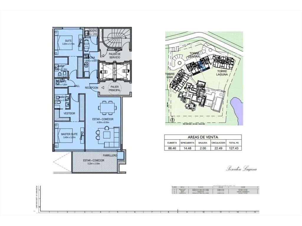 Departamento en edificio POSEIDÓN LAGUNA 2 - planta a estrenar de 127 m2 totales y 88.5 m2 internos de los cuales ofrece un gran living comedor , cocina definida que finaliza en una terraza lavadero y dos dormitorios en suite siendo su master suite al frente con walk in closet. Terraza al mar con parrillero.