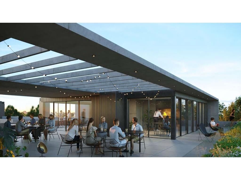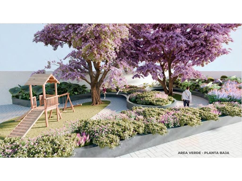 Amenities como solárium, gimnasio, barbacoa, playroom y una sala laundry equipada. Tambien un gran jardín verde de uso recreativo.