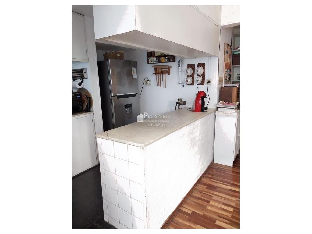 Cocina definida con muebles aéreos y bajo mesada, barra desayunadora y comedor diario con salida a cochera abierta.