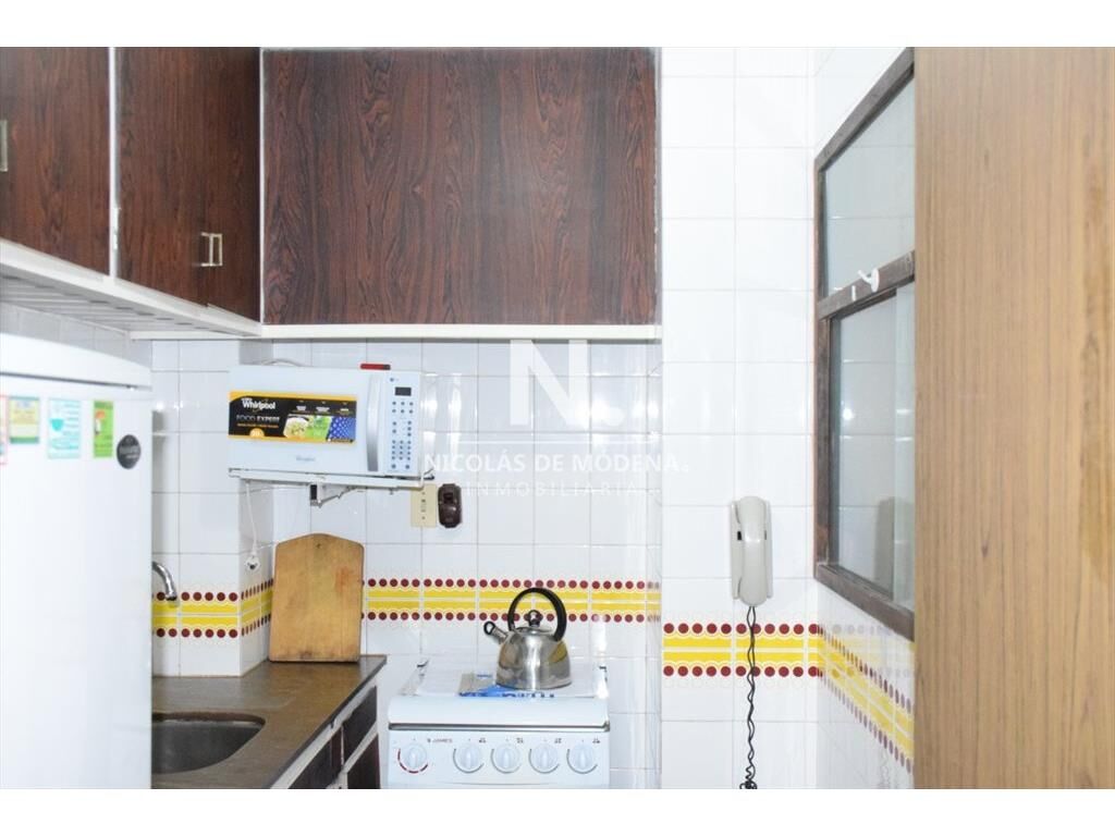 La cocina está equipada con todos los elementos esenciales, incluyendo anafe, microondas, heladera con freezer y horno, proporcionando todas las comodidades necesarias para preparar comidas durante su estadía. El apartamento también cuenta con aire acondicionado y televisión para garantizar el confort de los huéspedes.