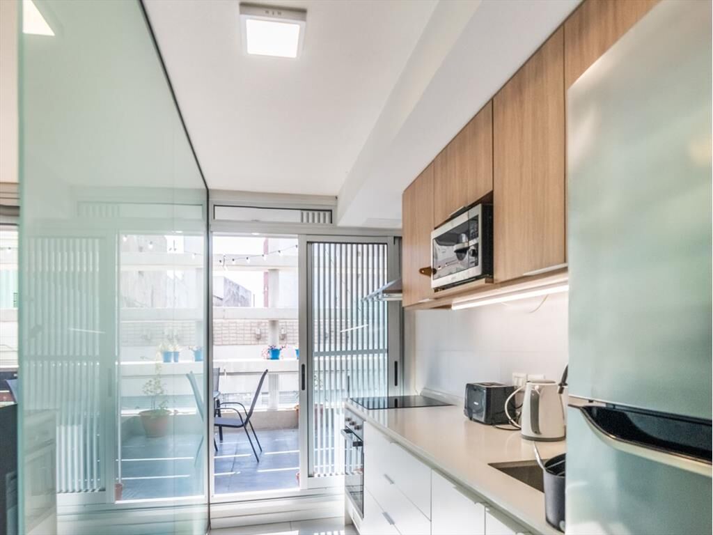 Cocina amplia y definida,cuenta con campaña de extración, anafe vitrocerámico y horno empotrado. Mesada de cuarzo y grifería monocomando. Amplitud de placares aéreos y bajomesada.