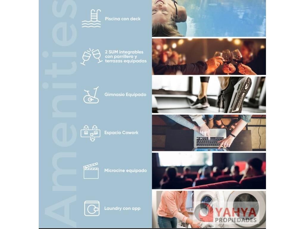El edificio dispondrá de 3 ascensores, 2 Salones de Usos Múltiples con parrillero, heladera y anafe, los cuales se podrán integrar; Cowork; Solarium con Piscina, Microcine equipado, Gimnasio equipado y Lavadero con máquinas lavasecarropas.