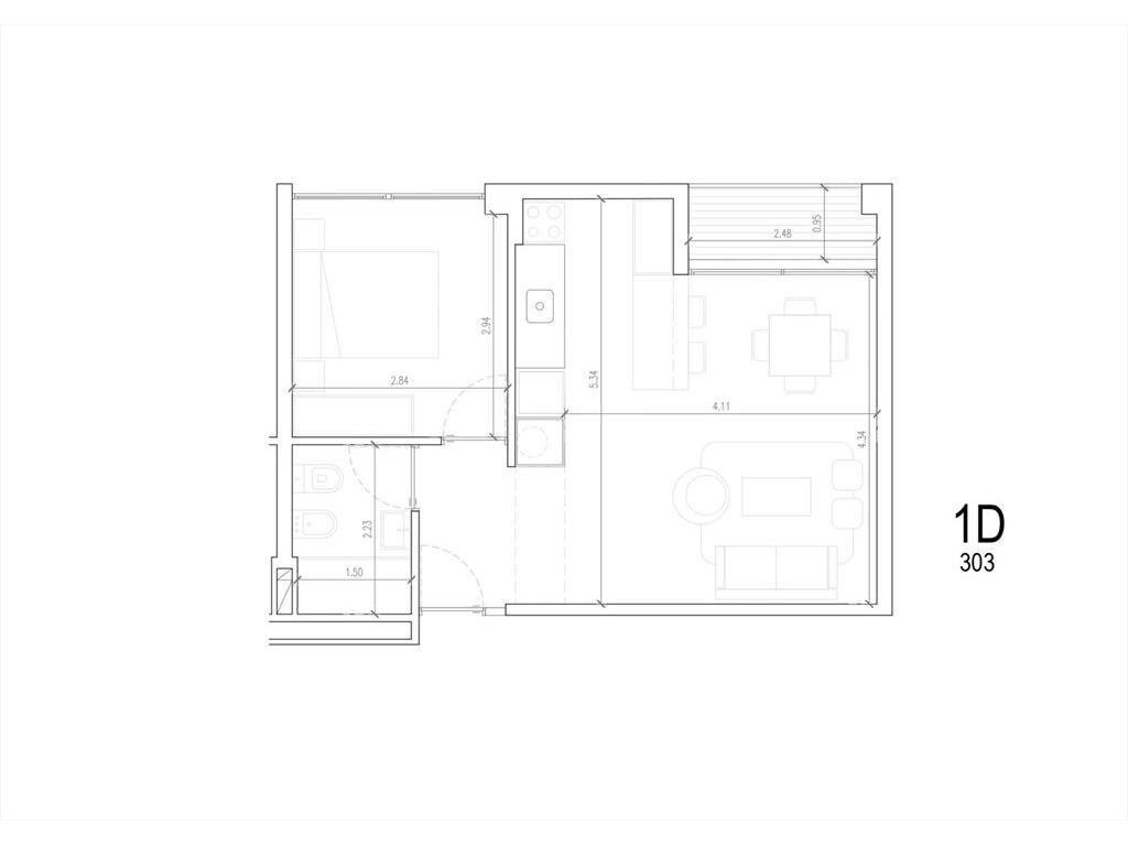 Living comedor con acceso a terraza de uso exclusivo, cocina integrada con bajo mesada. Baño completo. Dormitorio al frente.