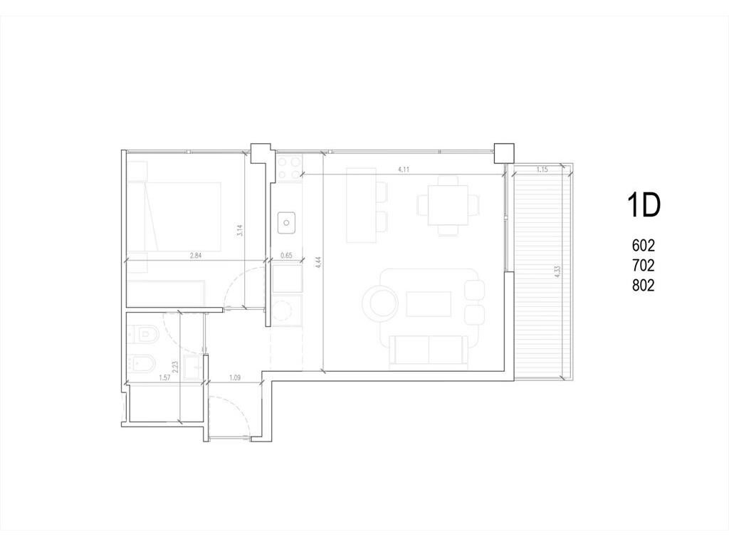 Living comedor con acceso a terraza de uso exclusivo, cocina integrada con bajo mesada. Baño completo. Dormitorio al frente.