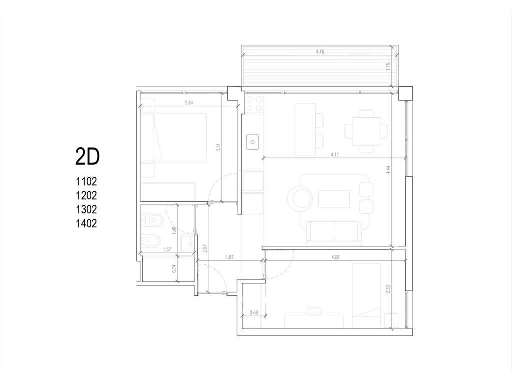 Living comedor con acceso a terraza de uso exclusivo, cocina integrada con bajo mesada. Baño completo. Dos dormitorios.