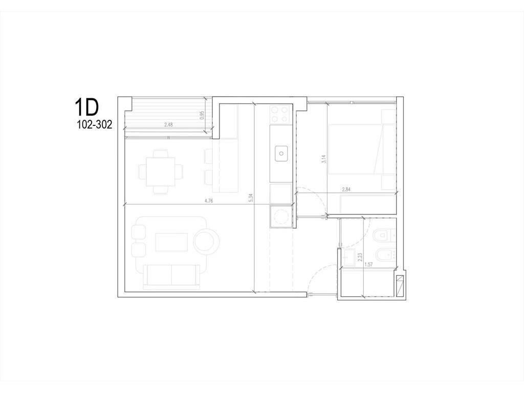 Living comedor con acceso a terraza de uso exclusivo, cocina integrada con bajo mesada. Baño completo. Dos dormitorios.