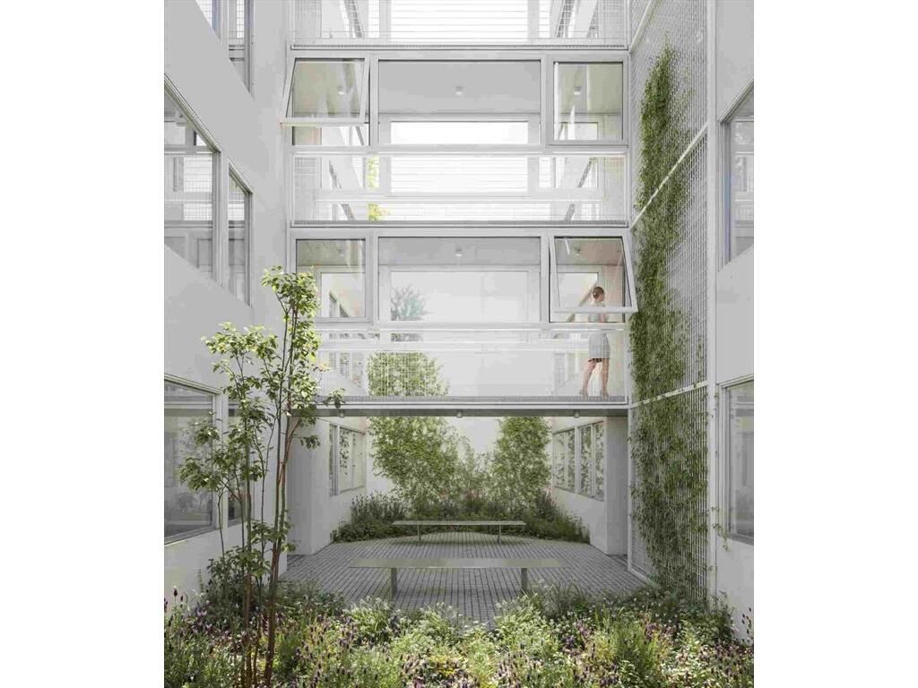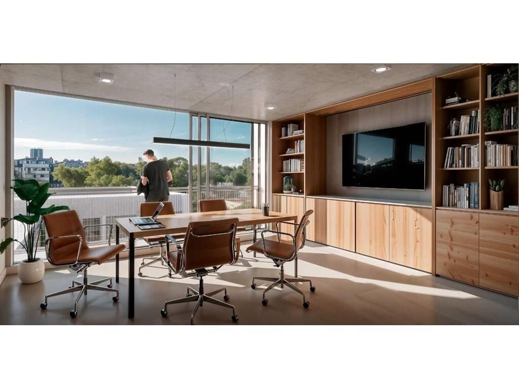 • Interiores: tabiques divisorios en yeso con aislación acústica, pisos vinílicos simil madera con zócalos de PVC blanco, cielorrasos de hormigón visto.