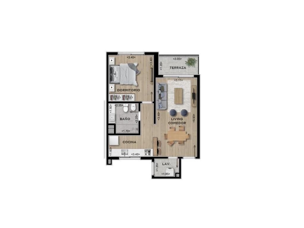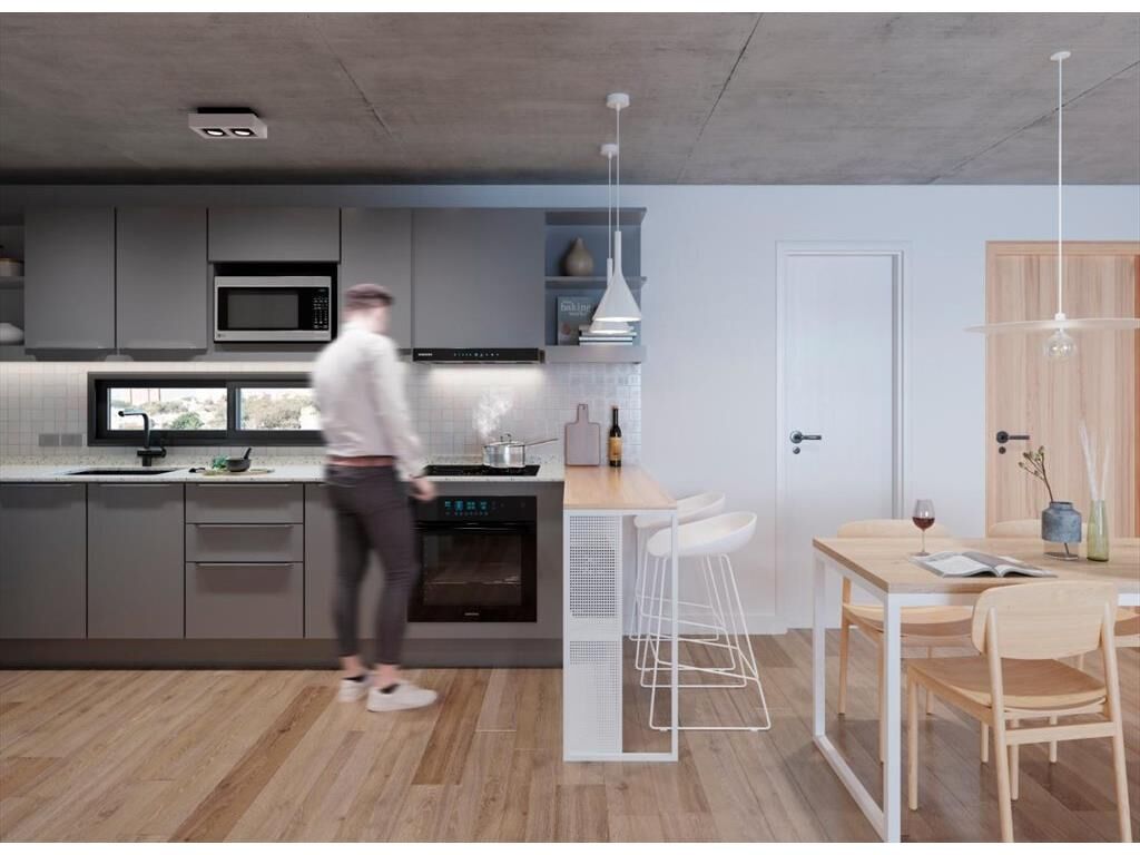 Aparamento Living comedor con acceso a Terraza. Cocina integrada con modernos muebles bajo mesada y aéreos, equipados con campana extractora, horno y anafe eléctricos instalados. Baño completo. Un dormitorio con placard. Habitación para lavarropas.