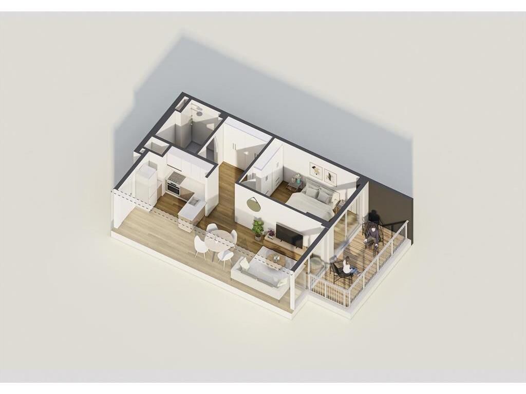 El dormitorio es amplio y está situado al lado de la sala de estar, con acceso a un baño completo. La disposición de las habitaciones permite un flujo cómodo y funcional dentro del apartamento.