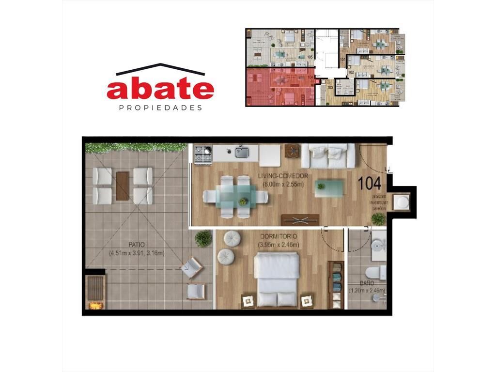 Apartamento en primer piso, con patio exclusivo. La unidad ofrece cómodo living comedor con cocina integrada equipada con muebles bajo y sobre mesada. 1 Dormitorio.