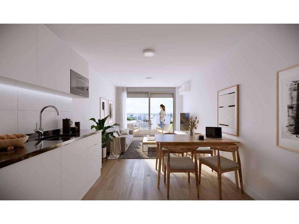 La cocina se conecta a un balcón al frente, perfecto para disfrutar del aire libre. Siguiendo hacia el interior, se accede a un baño revestido con porcelanato, equipado con instalaciones de alta calidad.