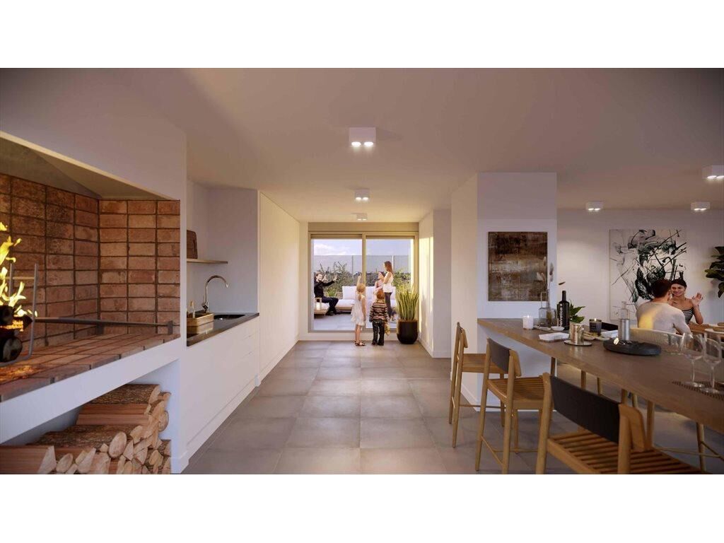 La cocina se conecta a un balcón al frente, perfecto para disfrutar del aire libre. Siguiendo hacia el interior, se accede a un baño revestido con porcelanato, equipado con instalaciones de alta calidad.