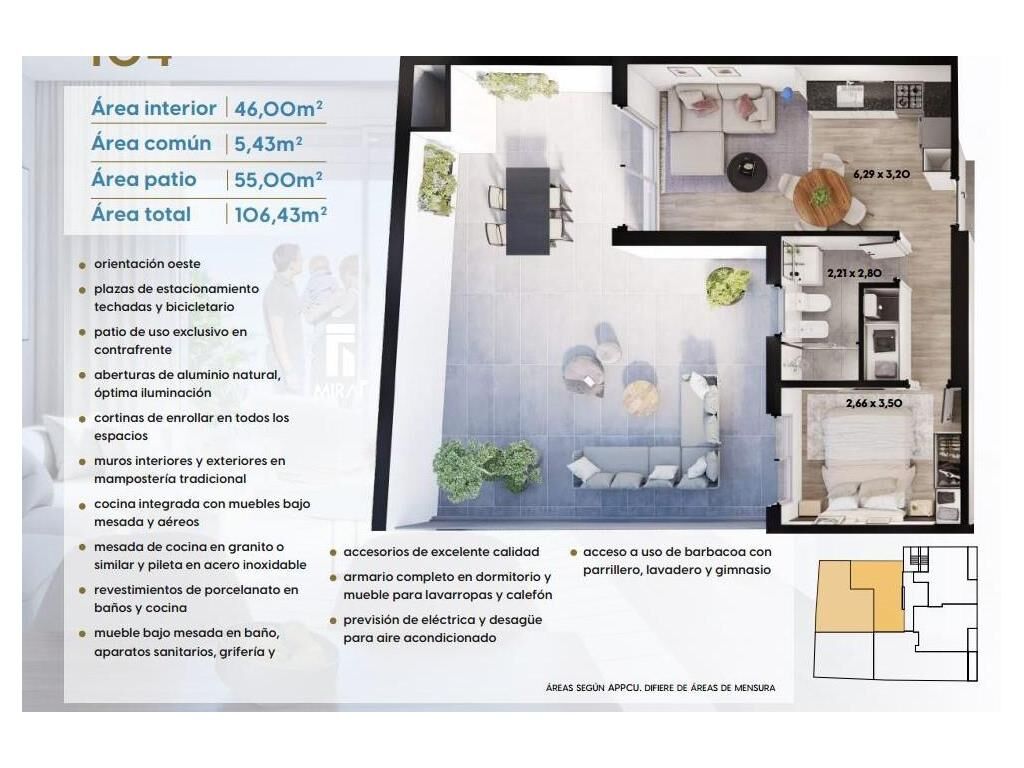 Apartamento con living comedor con cocina integrada con muebles bajo mesada y aéreos. Salida a amplio patio de 55 metros cuadrados de uso exclusivo. Muros interiores y exteriores en mampostería tradicional. Aberturas de aluminio natural, óptima iluminación, cortinas de enrollar en todos los espacios 1 Dormitorio con armario completo . Baño con mueble bajo mesada, aparatos sanitarios, grifería y accesorios de excelente calidad. Mueble para lavarropa y calefón.