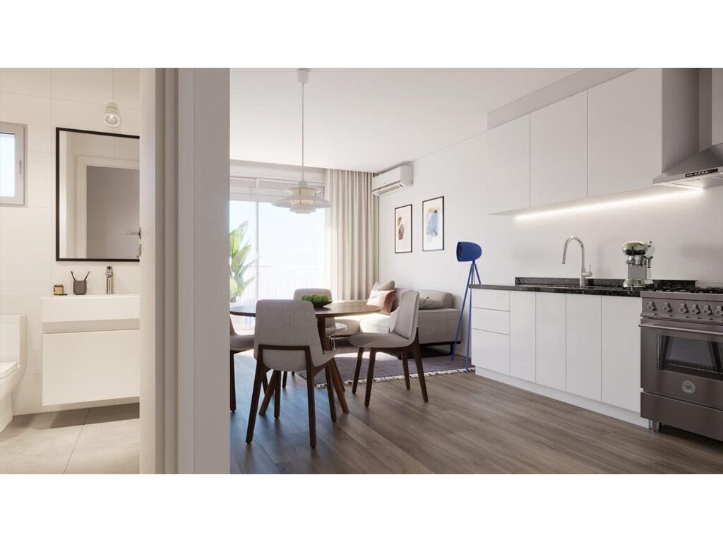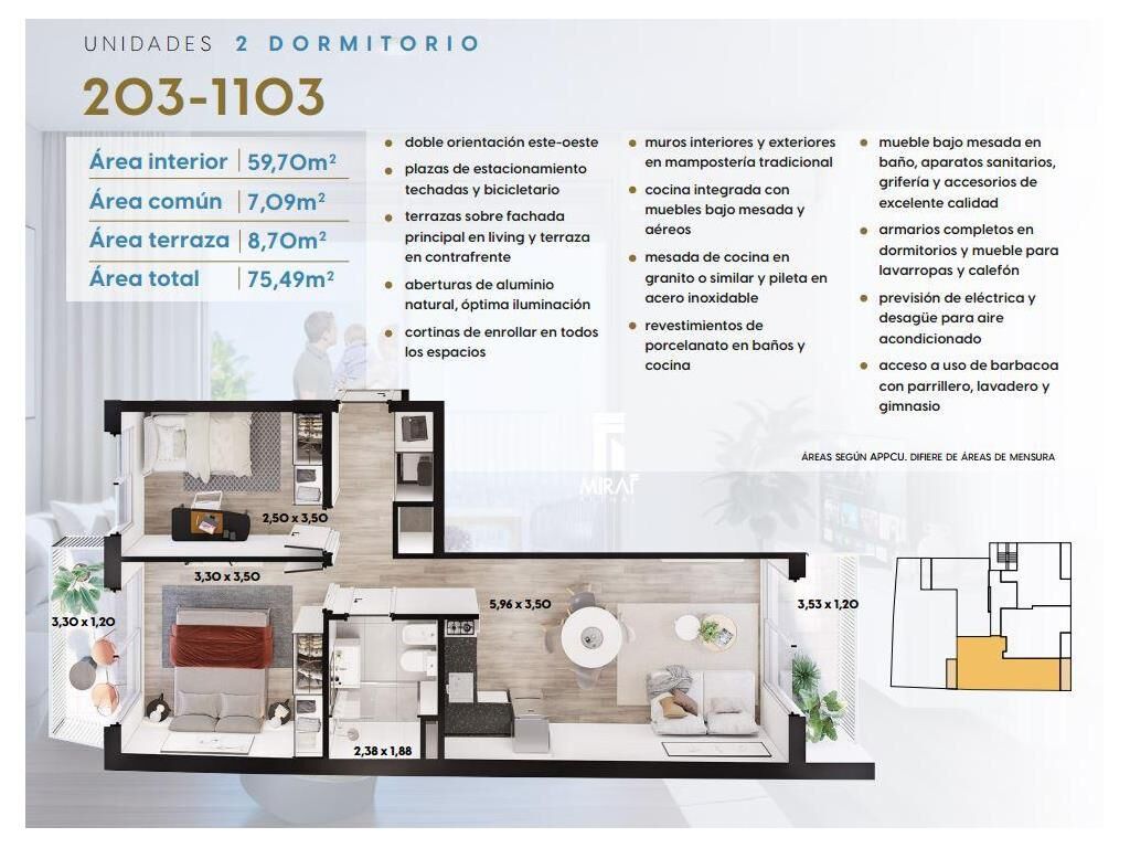 Apartamento de doble orientación Este - Oeste con espacio recibidor, living comedor con cocina integrada con muebles bajo mesada y aéreos. Salida a cómoda terraza al frente. Muros interiores y exteriores en mampostería tradicional. Aberturas de aluminio natural, óptima iluminación, cortinas de enrollar en todos los espacios Dormitorio principal con placard y salida a segunda terraza contrafrente. Segundo dormitorio también con placares. Baño con mueble bajo mesada, aparatos sanitarios, grifería y accesorios de excelente calidad. Mueble para lavarropa y calefón.